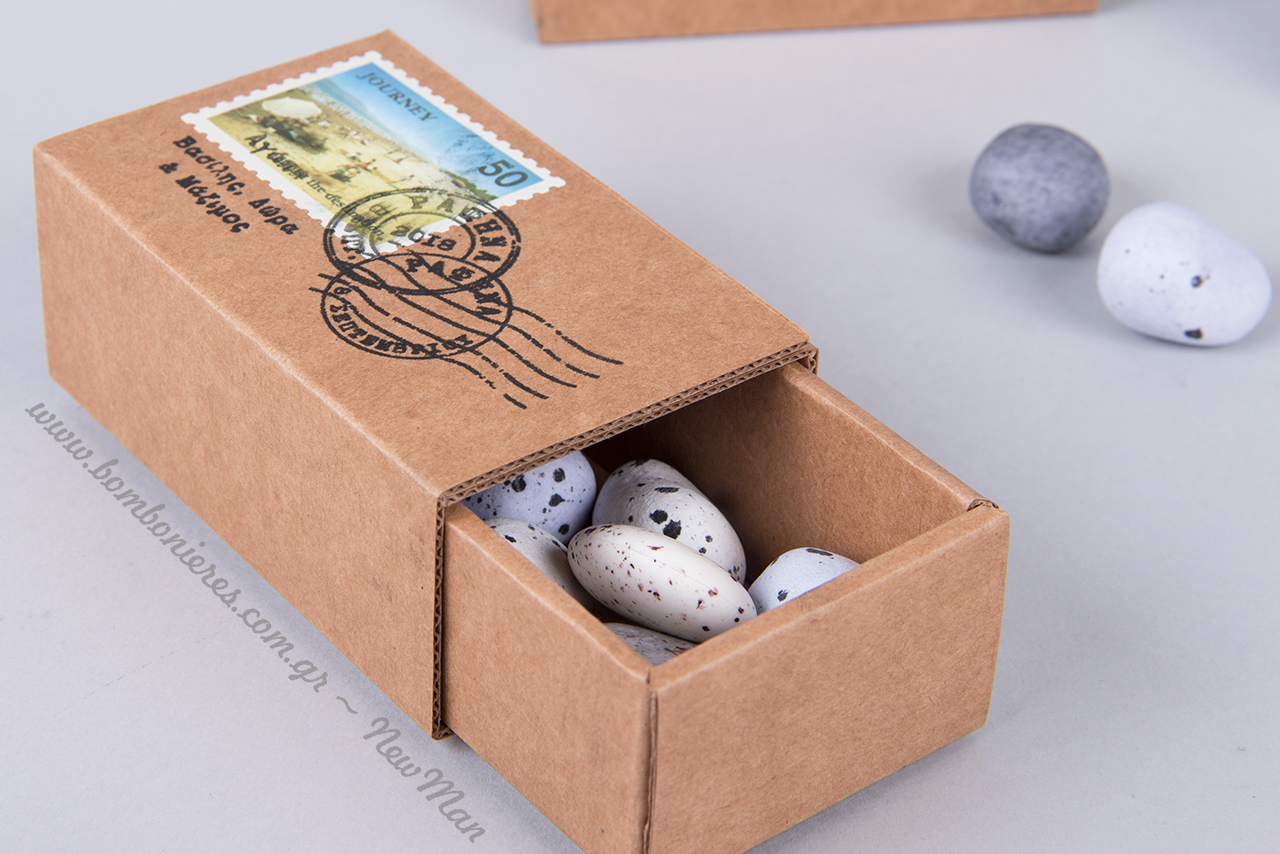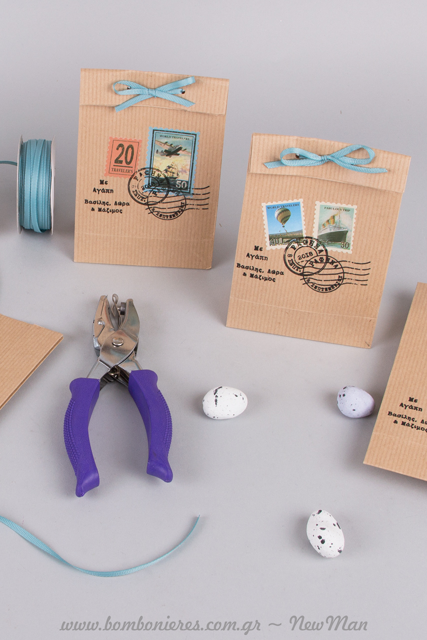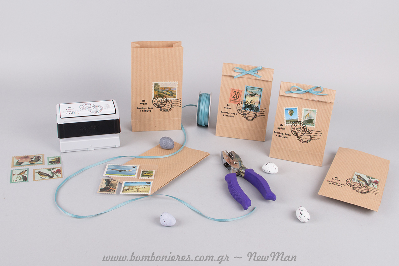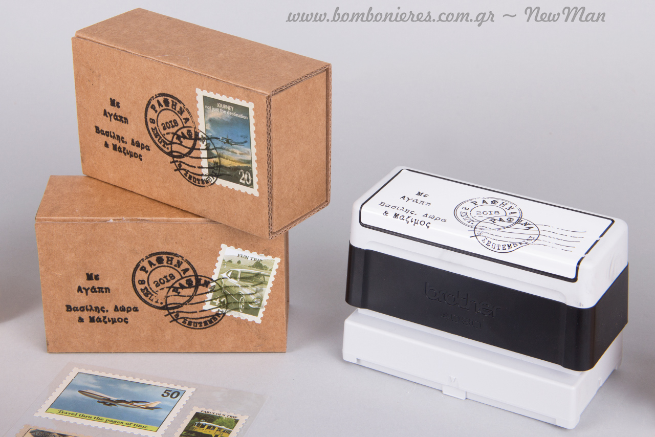 Ταχυδρομικές/ταξιδιωτικές μπομπονιέρες σε τσάντα φάκελο Kraft No 1 (95 x 165 x 50mm) ή σε χάρτινο οικολογικό κουτί Kraft (παραγωγής Newman), διακοσμημένες με χάρτινα γραμματόσημα σε διάφορα σχέδια, κορδέλα γκρο (γαλάζια) και προσωποποιημένες σφραγίδες Brother.
