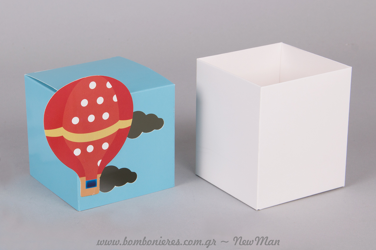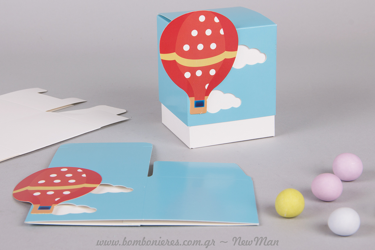 Εύκολα στη συναρμολόγηση, τα χάρτινα κουτάκια (7 x 7cm), με θέμα Αερόστατο, θα αποτελέσουν ένα υπέροχο ενθύμιο της βάπτισης του μικρού σας και θα ξεχωρίσουν χάρη στα ζωντανά χρώματα και το προσεγμένο σχέδιό τους.