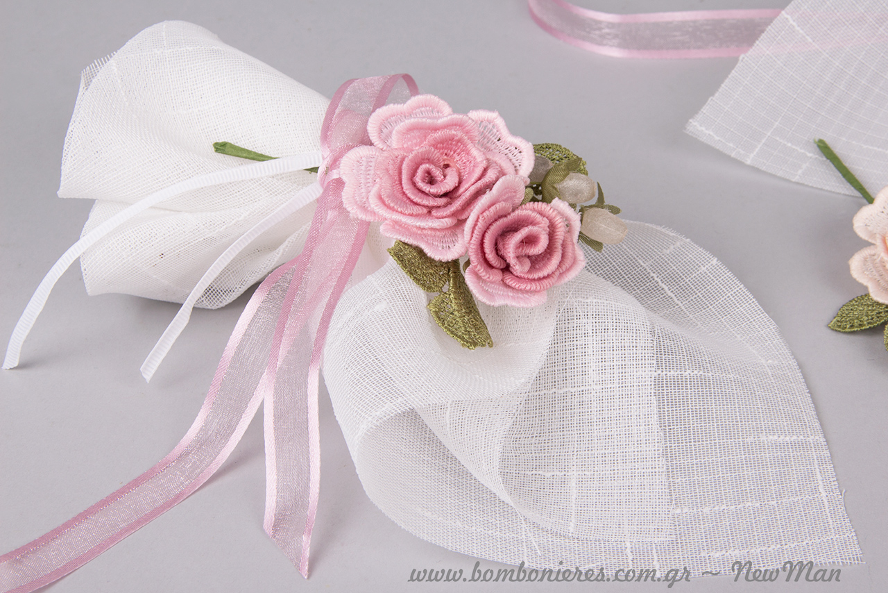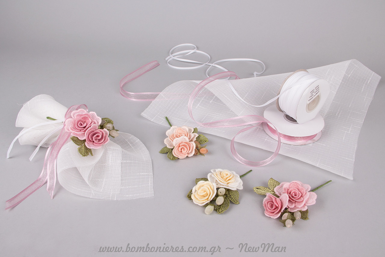 Τα υλικά που θα χρειαστείτε για τη δημιουργία της είναι: λινό ύφασμα (33 x 33cm), κορδέλα οργαντέ Satin, κορδέλα Gros, κουφέτα και φυσικά τα κλαδάκια με κιπούρ τριαντάφυλλα.