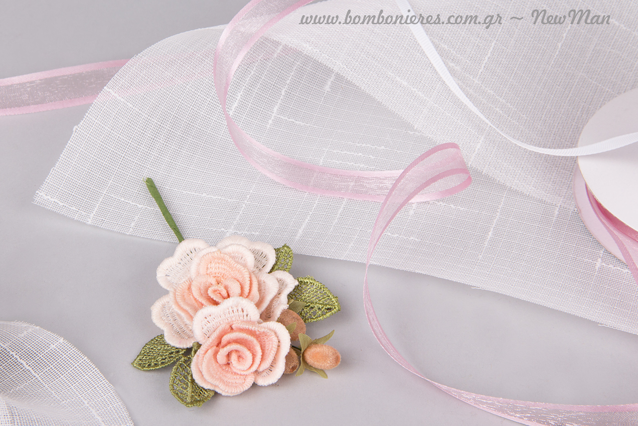 Το λινό ύφασμα στη βάση σε συνδυασμό με τα τριανταφυλλένια κλαδάκια κιπούρ και τις κορδέλες, δημιουργεί μια αίσθηση απαλότητας και τρυφεράδας, κάνοντας την μπομπονιέρα αυτή να μοιάζει με έναν εύθραυστο ρομαντικό θησαυρό που θα απογειώσει αισθητικά τη μέρα του γάμου σας.