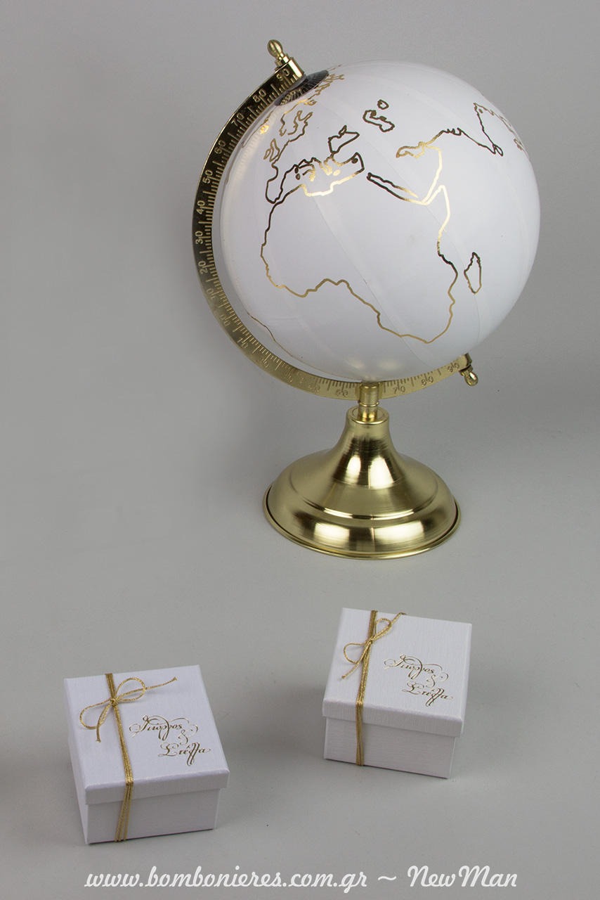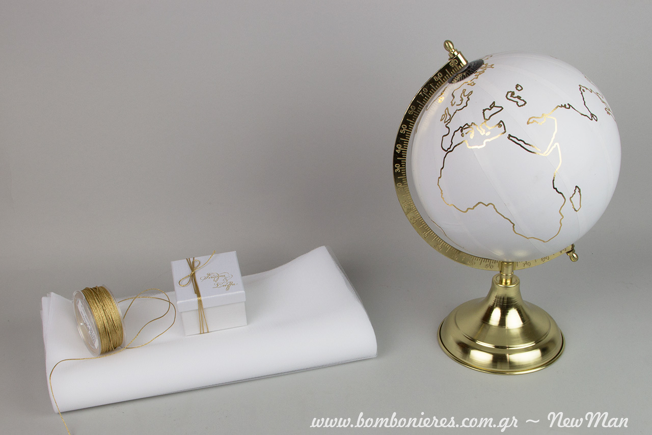 Κι αν έχετε ήδη ερωτευτεί το συνδυασμό λευκού-χρυσού στην μπομπονιέρα κουτί, σίγουρα θα λατρέψετε και την πανέμορφη υδρόγειο, ένα διακοσμητικό στοιχείο που θα εντυπωσιάσει τόσο με την κομψότητα όσο και με τους συμβολισμούς του.