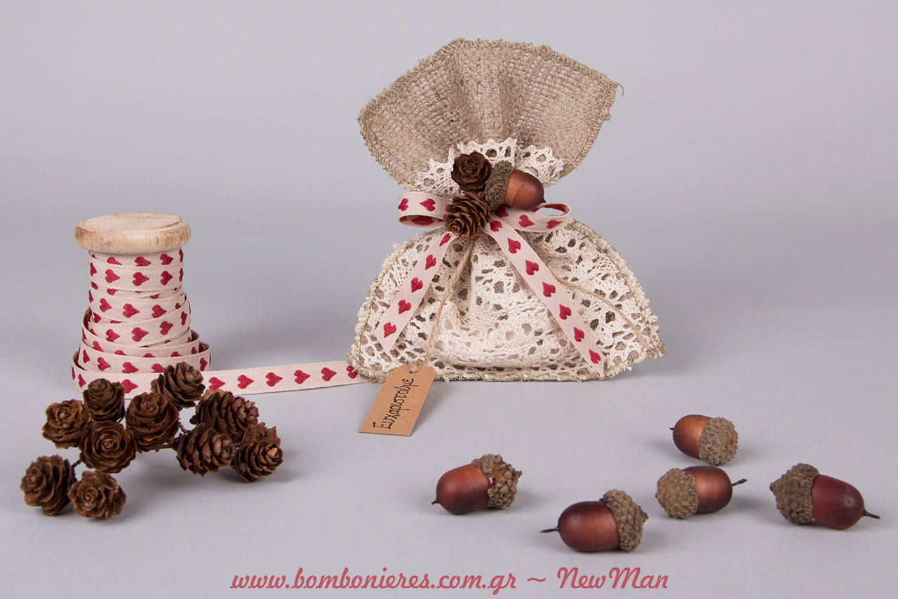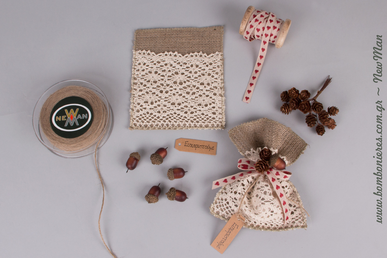 Για τη δημιουργία της θα χρειαστείτε τα εξής υλικά: πουγκάκια από λινάτσα και δαντέλα (διατίθενται σε συσκευασία των 10 τεμαχίων), τούλι ελληνικό, κορδόνι γιούτα ψιλό, κορδέλα εκρού με κόκκινες καρδούλες, καρτελάκι με ευχαριστήριο μήνυμα ή ευχές (τύχη, αγάπη, ευτυχία, υγεία, χαρά κα.), κουφέτα Χατζηγιαννάκης, βελανίδια και κουκουνάρια ματσάκι.