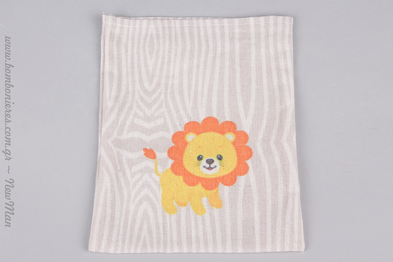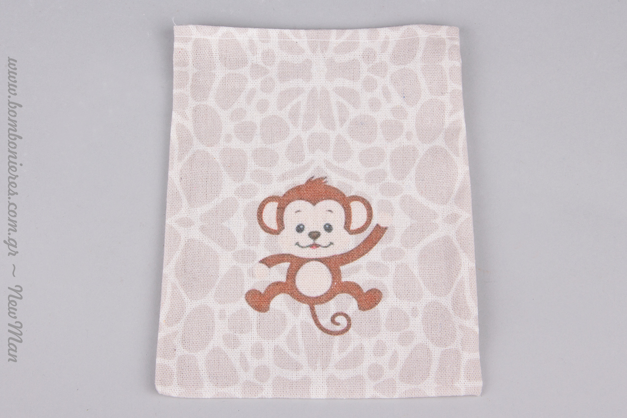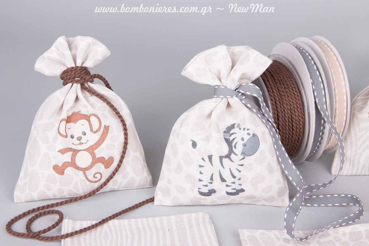 Λιονταράκι, μαϊμού, ελεφαντάκι, τίγρη, καμηλοπάρδαλη ή ζέβρα, τα λινά πουγκάκια με ζώα της ζούγκλας (μωρά), προσφέρονται για πολλούς όμορφους συνδυασμούς με κορδέλες ή κορδόνια, αναλόγως και το συνολικό ύφος που επιθυμείτε. Εμείς προτείνουμε κορδέλα βαμβακερή με γαζί (ούγια) σε εκρού και γκρι ή κορδόνι βαμβακερό σε σοκολατένια απόχρωση.