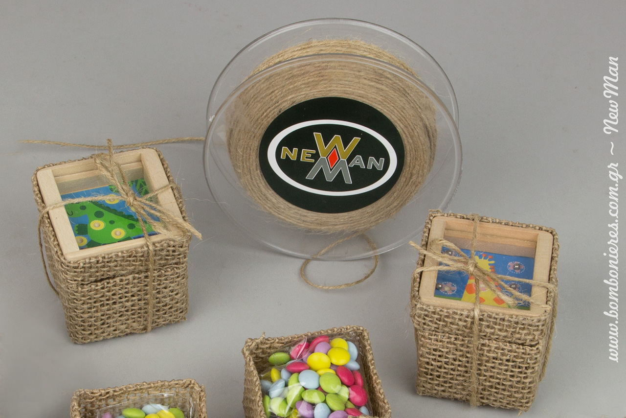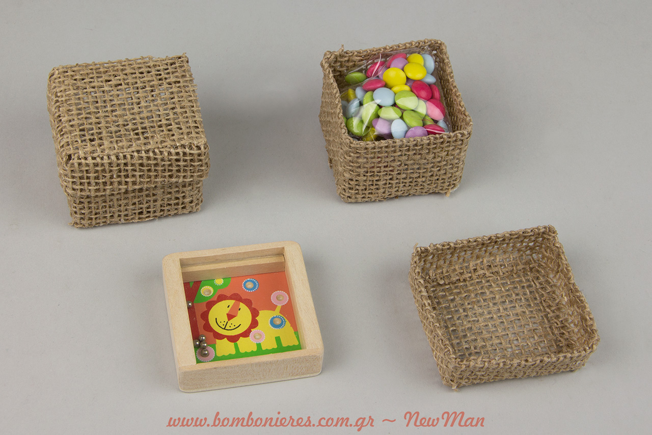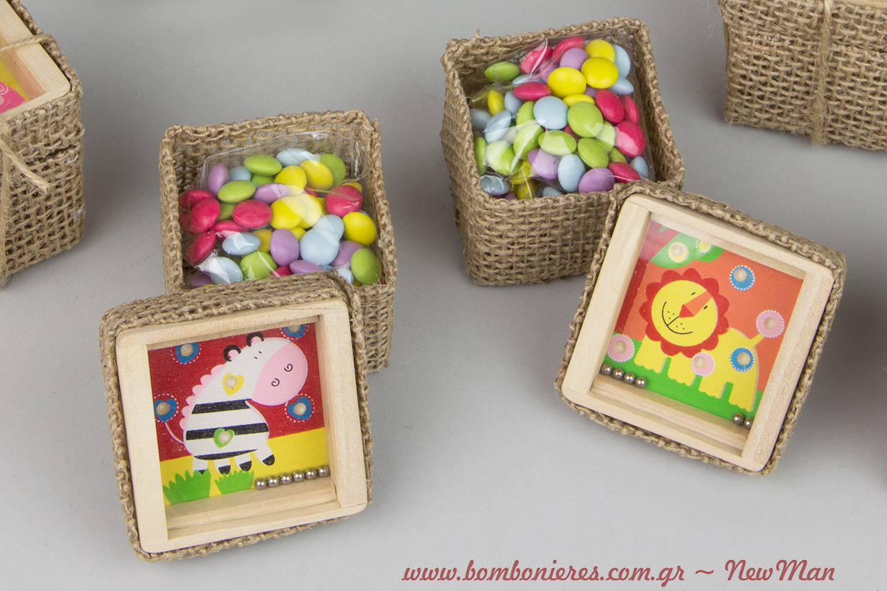 Για τη δημιουργία της θα χρειαστείτε τα εξής υλικά: ξύλινο παιχνίδι με μπιλίτσες και σχέδιο ζωάκια (λιοντάρι, ζέβρα, δεινόσαυρος, μαϊμού κα.), το οποίο διατίθεται σε συσκευασία των 4 τεμαχίων, ψάθινα κουτιά, κορδόνι γιούτα ψιλό και κουφέτα Χατζηγιαννάκης Mini Rondo Bebe πολύχρωμο.