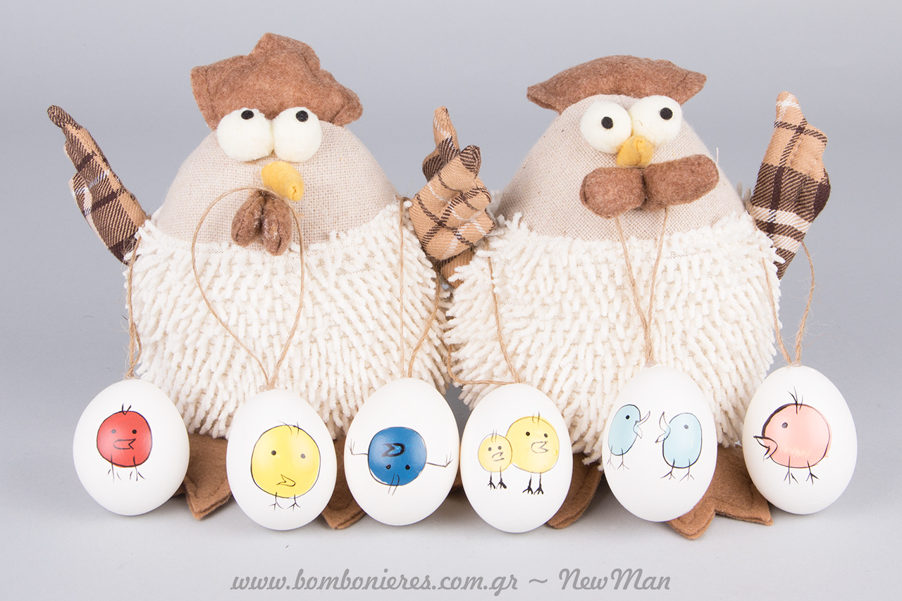 Τα πάνινα κοτοπουλάκια (15cm) καθώς επίσης και τα κρεμαστά αβγά με σχέδιο πουλάκια (διατίθενται σε συσκευασία των 6 τεμαχίων) θα προσδώσουν στην πασχαλινή σας διακόσμηση την ανοιξιάτικη νότα που επιθυμείτε με απλότητα και με μια έξτρα δόση χιούμορ που τόσο έχουμε ανάγκη.