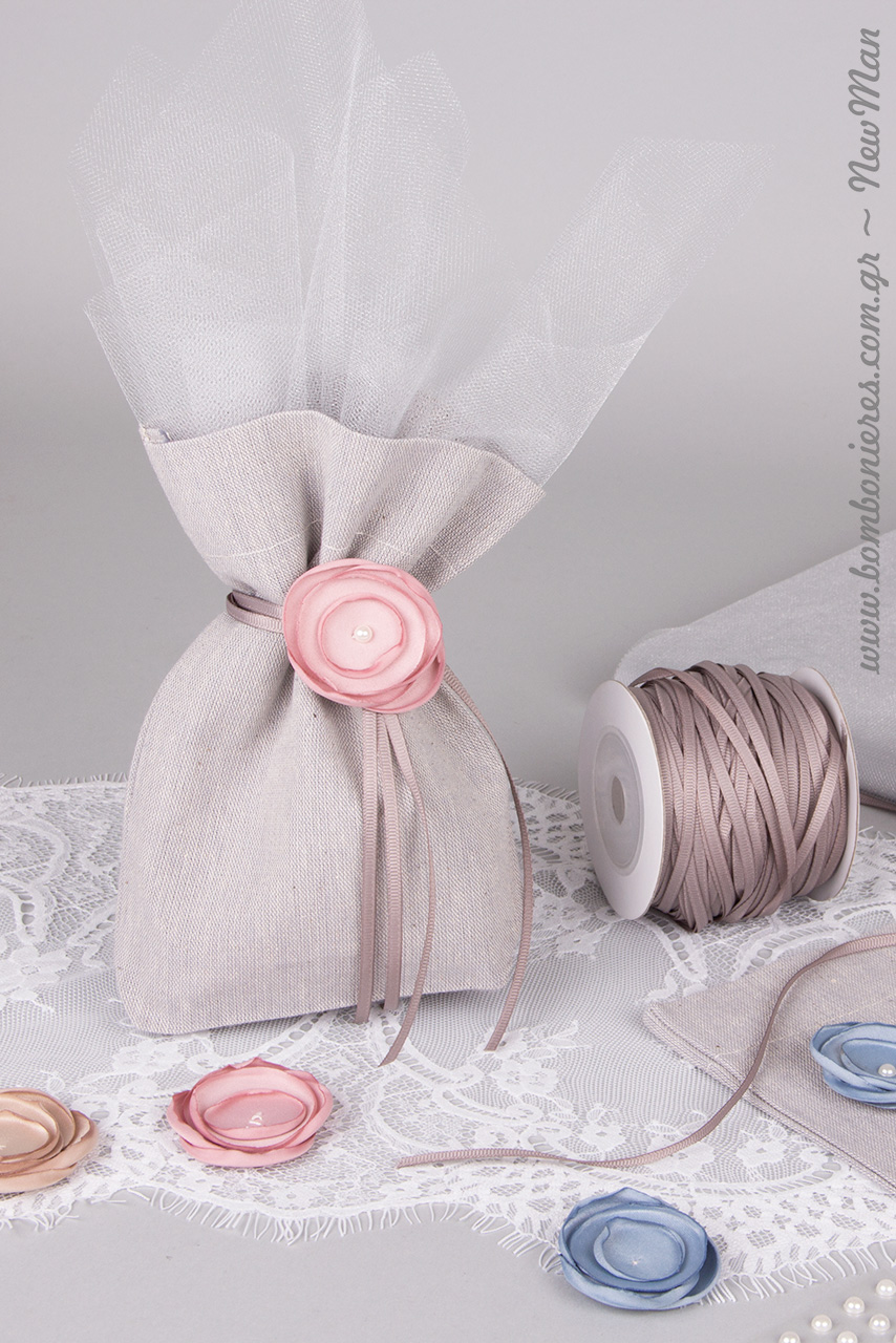 Tα υλικά που θα χρειαστείτε για τη δημιουργία της είναι: γκρι πουγκάκια με πάτο (10 x 16cm), κορδέλα γκρο σε γκρι απόχρωση, τούλι γαλλικό (ασημί κρυσταλλιζέ) και φυσικά τα υφασμάτινα λουλούδια (στυλ καμμένο), τα οποία διατίθενται σε 5 διαφορετικές αποχρώσεις: σάπιο μήλο, καφέ, πούρου, Ραφ και καφέ-λαδί.