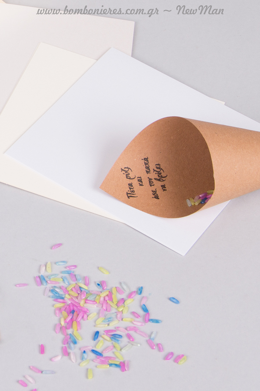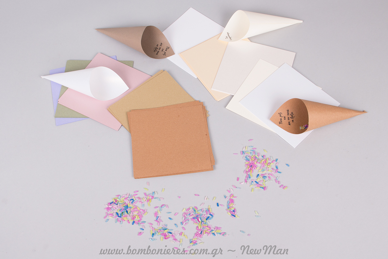Τα DIY χωνάκια μας για ρύζι, είναι πολύ χαριτωμένα και απλά στην κατασκευή τους. Τα μόνα υλικά που θα χρειαστείτε είναι χαρτάκια χειροτεχνίας για χωνάκια (12×12εκ.) και ταινία διπλής όψεως. Τα χαρτάκια μας διατίθενται σε μια ποικιλία παλ χρωμάτων, ροζ, φυσικό, λευκό, πράσινο της ελιάς, σιέλ, μπεζ, σπασμένο λευκό κα. για να διαλέξετε αυτά που ταιριάζουν καλύτερα με τον στολισμό σας.