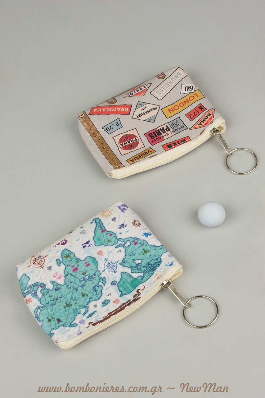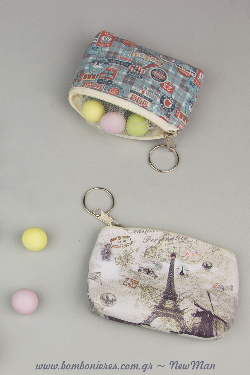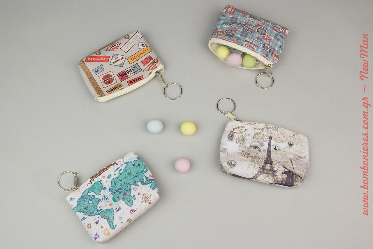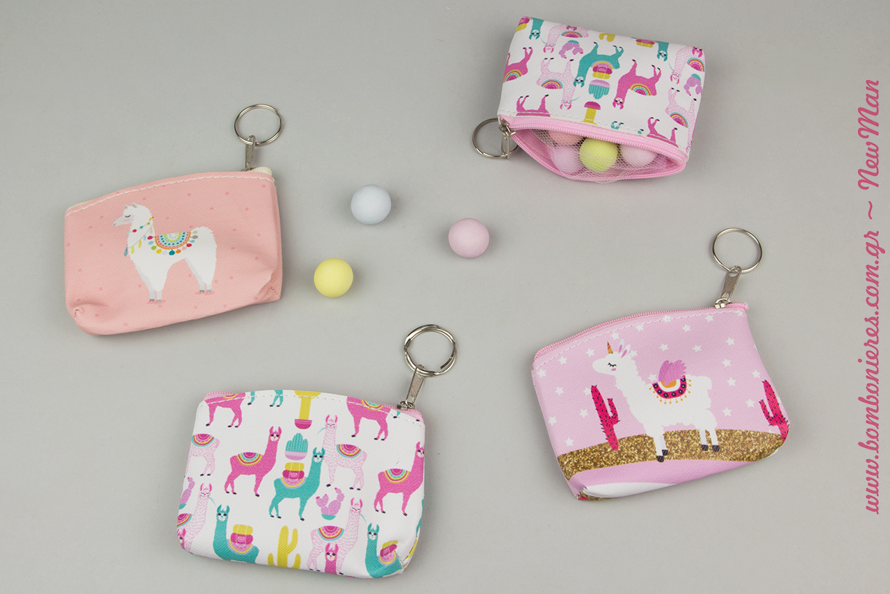 Αν το θέμα που επιλέξατε έχει σχέση με ταξίδια, χώρες και περιλαμβάνει στοιχεία όπως η υδρόγειος, οι παγκόσμιοι χάρτες, τα ΜΜΜ, τότε τα πορτοφολάκια-μπρελόκ με σχέδιο χάρτη, πύργο του Άιφελ, αυτοκόλλητα κα. είναι απολύτως ταιριαστά. Αν πάλι έχετε πιο ρομαντική διάθεση ή ψάχνετε για αμιγώς κοριτσίστικη μπομπονιέρα προτιμήστε τα ροζ πορτοφολάκια με σχέδιο Llama, τα οποία διατίθενται σε συσκευασία των 6 τεμαχίων και σε διάφορες παραλλαγές. Οι λεπτομέρειες κάθε σχεδίου είναι πανέμορφες και οι παστέλ αποχρώσεις τους, χαρούμενες κι εντελώς κοριτσίστικες.