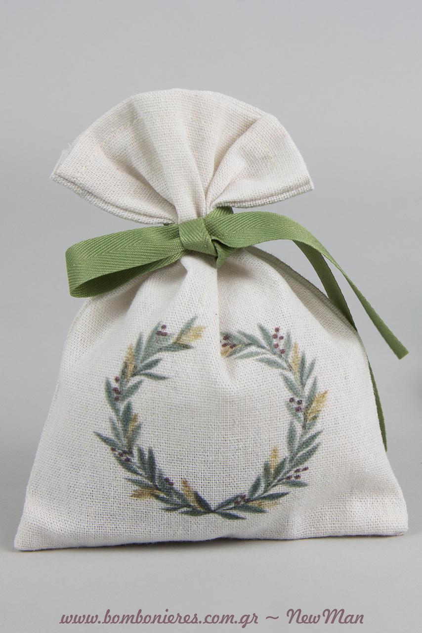 Μπομπονιέρα σε πουγκί λευκό (καραβόπανο) με σχέδιο στεφάνι ελιάς (κότινο) διακοσμημένο με κορδέλα φακαρόλα σε λαδί απόχρωση για ένα κλασικό και ιδιαίτερα οικονομικό ενθύμιο της σημαντικής σας ημέρας.