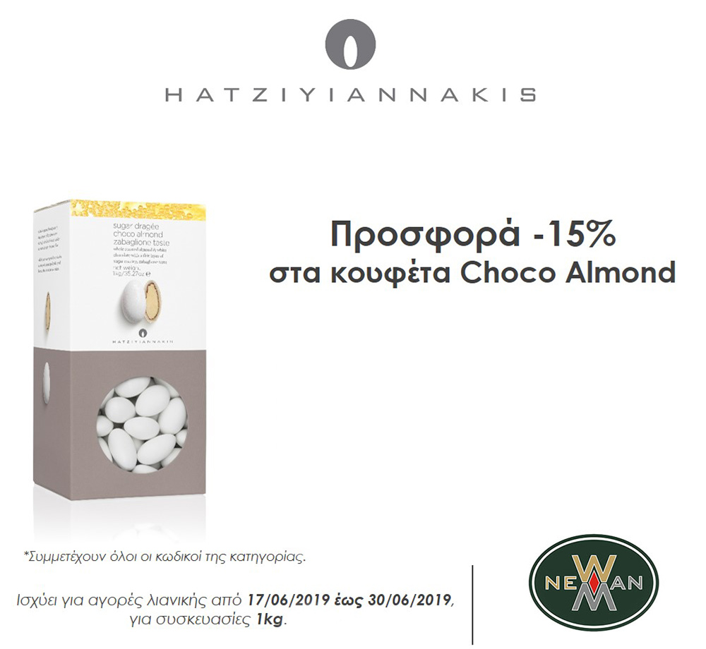 Από την Δευτέρα 17/6/2019 μέχρι και την Κυριακή 30/6/2019, έκπτωση 15% στα κουφέτα Choco Almond. Ισχύει για αγορές λιανικής και για συσκευασίες του 1kg. Συμμετέχουν όλοι οι κωδικοί της κατηγορίας.