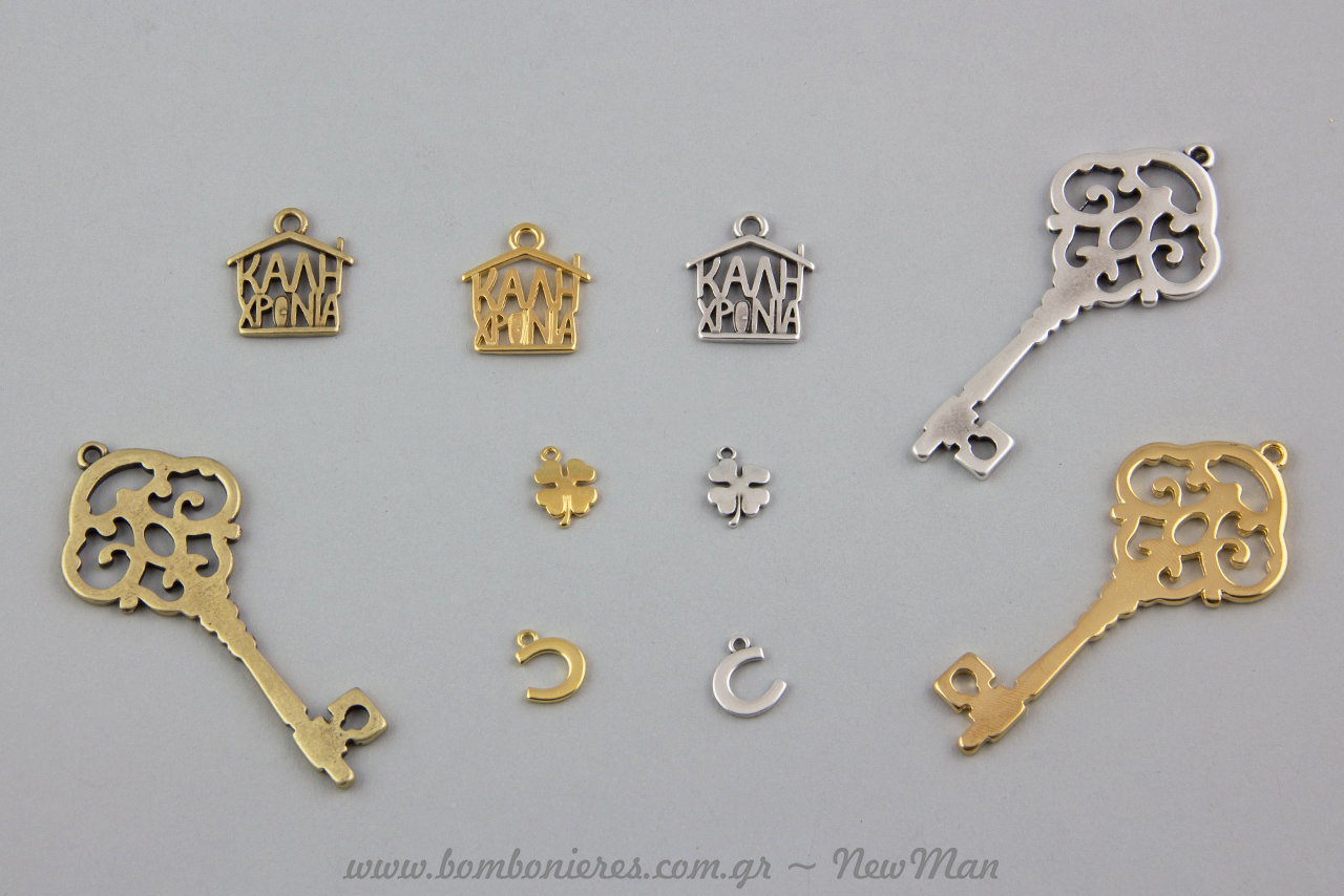 Μεταλλικό σπίτι «Καλή χρονιά» σε τρεις διαφορετικές αποχρώσεις (επάργυρο-χρυσαφί-μπρονζέ), κλειδί αντικέ επίσης σε διαφορετικές αποχρώσεις (γυαλιστερό χρυσό, επάργυρο, μπρονζέ), κρεμαστό γούρι- σπιτάκι με πέταλο, τετράφυλλο τριφύλλι, κλειδί και ρόδι στην βάση του (επάργυρο, χρυσό, μπρονζέ) και μικρά κρεμαστά πέταλα ή τετράφυλλα τριφύλλια σε επάργυρο ή χρυσό.