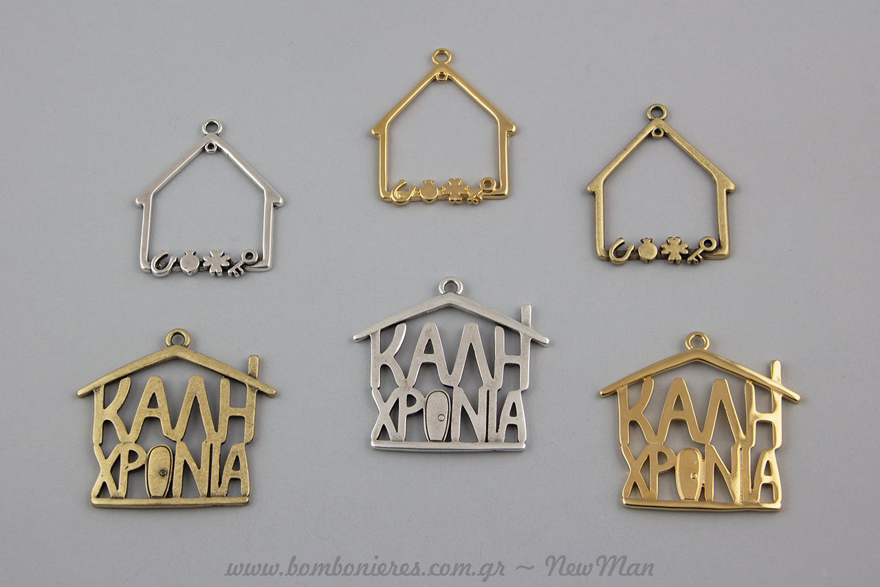 Τα μεταλλικά διακοσμητικά στοιχεία είναι λεπτοδουλεμένα και σχεδιασμένα έξυπνα όπως το σπιτάκι «Καλή χρονιά» με την ιδιαίτερη λεπτομέρεια του ο που είναι ταυτόχρονα κι η πόρτα του σπιτιού. Κάντε λοιπόν τους δικούς σας μοναδικούς συνδυασμούς, τα σπιτάκια συνδυάζονται ιδανικά με το αντικέ κλειδί για παράδειγμα, και δημιουργήστε τα πιο ιδιαίτερα γούρια για το 2018 που θα χαρίσετε σε φίλους συγγενείς ή συνεργάτες.