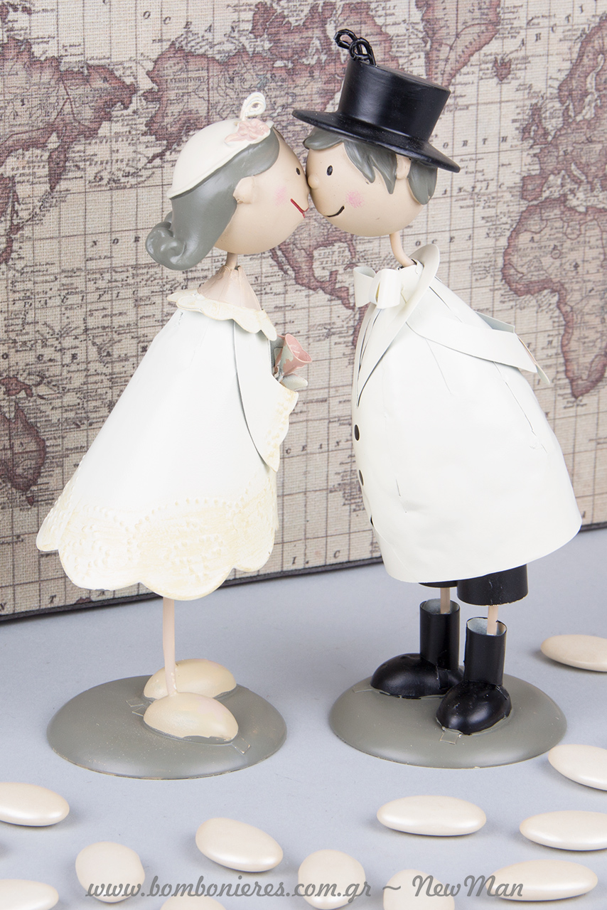 Το μεταλλικό ζευγάρι των νεονύμφων είναι σούπερ χαριτωμένο και μοιάζει να σαν να ξεπήδησε από παραμύθι. Η νύφη φορά καπελάκι και κρατά στο χέρι λουλουδάκια κι ο γαμπρός φορά ασπρόμαυρο κοστούμι, καπέλο και μπότες. Διαθέτουν επίσης μαγνήτη που τους επιτρέπει να ενώσουν τις φατσούλες τους στο γνωστό φιλί του πιγκουίνου (μύτη με μύτη).