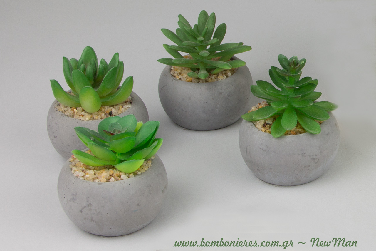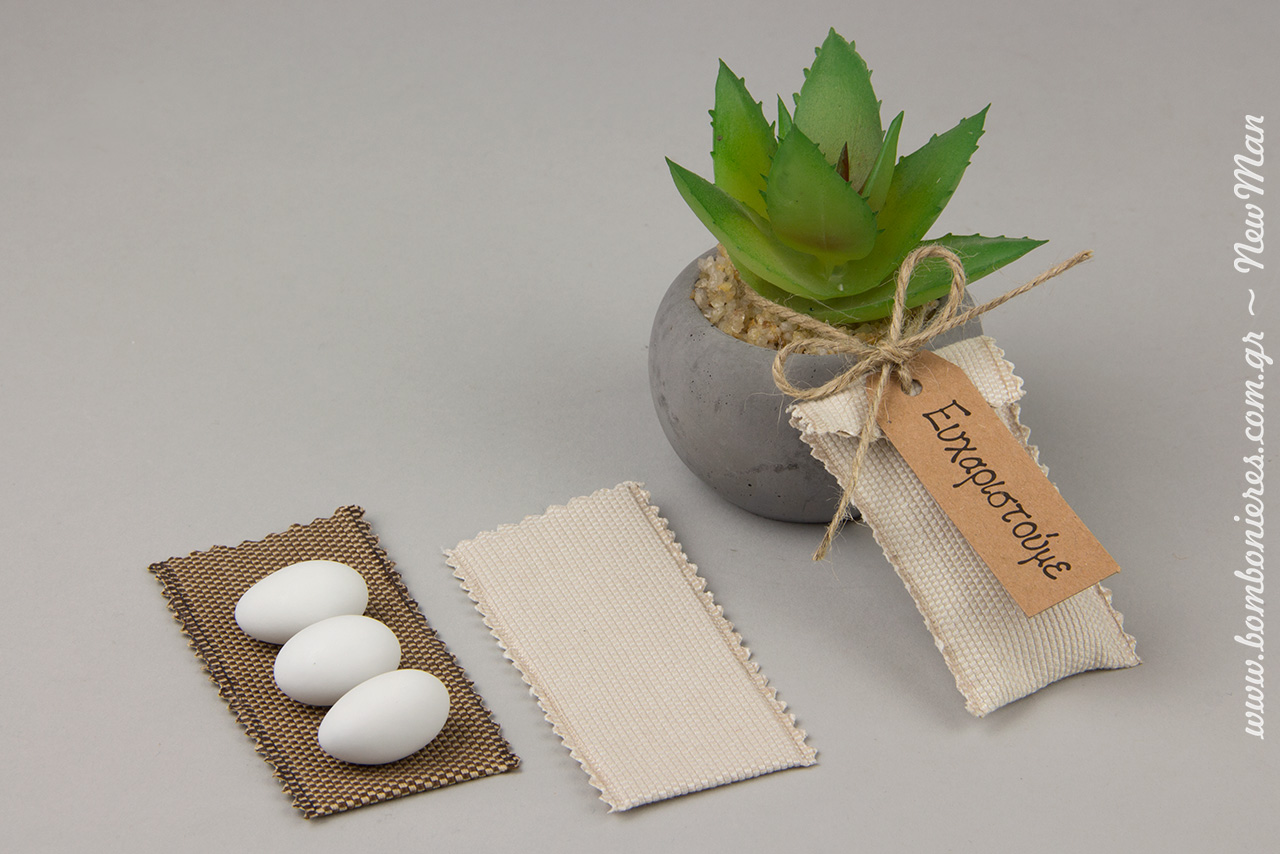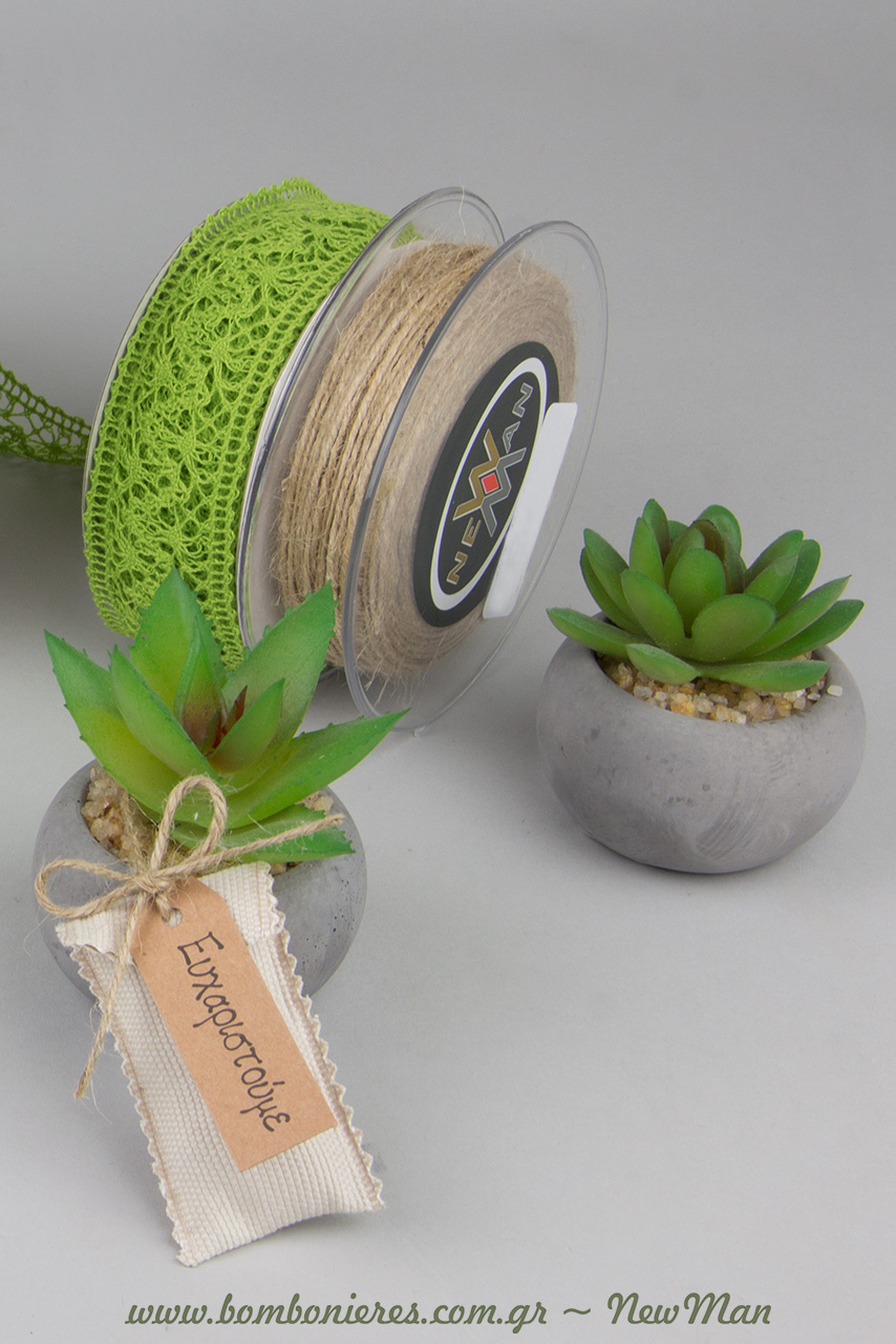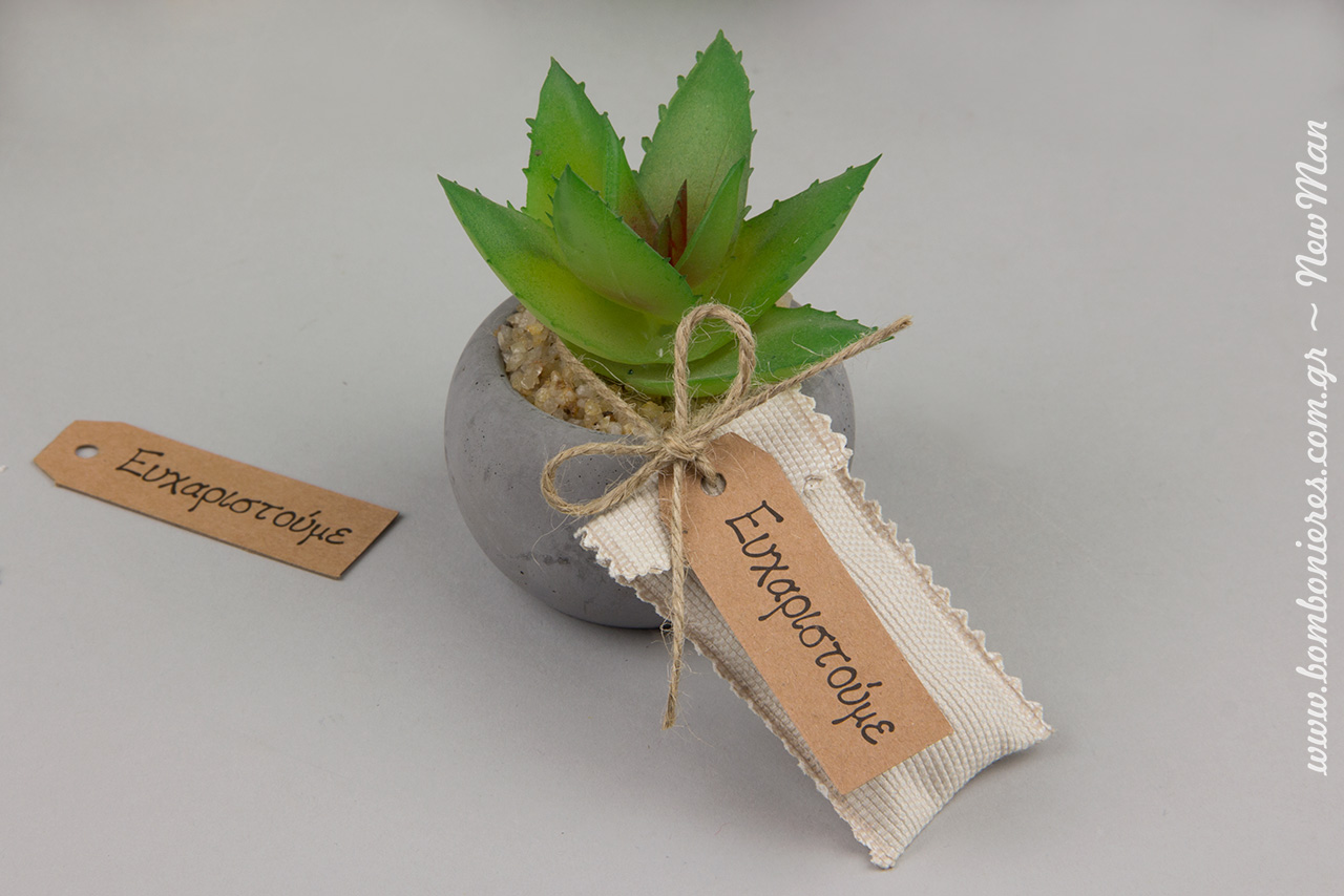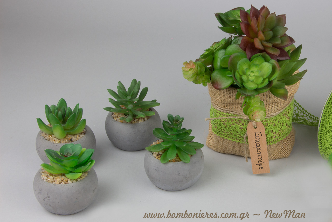 Για την μπομπονιέρα χρησιμοποιήσαμε τα στρογγυλά γλαστράκια από καλλιτεχνικό τσιμέντο με παχύφυτα ως έχουν, ενσωματώνοντας πάνω τους με κορδόνι γιούτα τα κεράσματα γάμου (40 x 80mm), τα οποία περιέχουν τα κουφέτα, σε συνδυασμό με μια ευχαριστήρια καρτούλα σε φυσική απόχρωση.