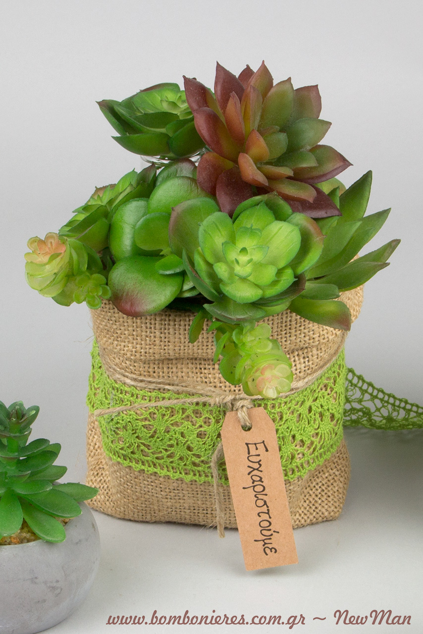 Για τα centerpieces στο τραπέζι της δεξίωσης τα αγαπημένα μας παχύφυτα τρυπώνουν μέσα σε πουγκάκια από φυσική λινάτσα (16 x 18cm), διακοσμημένα με κορδέλα δαντέλα σε ανοιχτή πράσινη απόχρωση και ευχαριστήρια καρτούλα. Μια ιδιαίτερη πρόταση, πιστή στο greenery ύφος που θα απογειώσει τον στολισμό των τραπεζιών της δεξίωσης, προσθέτοντας χρώμα και στυλ στη σημαντική σας ημέρα.