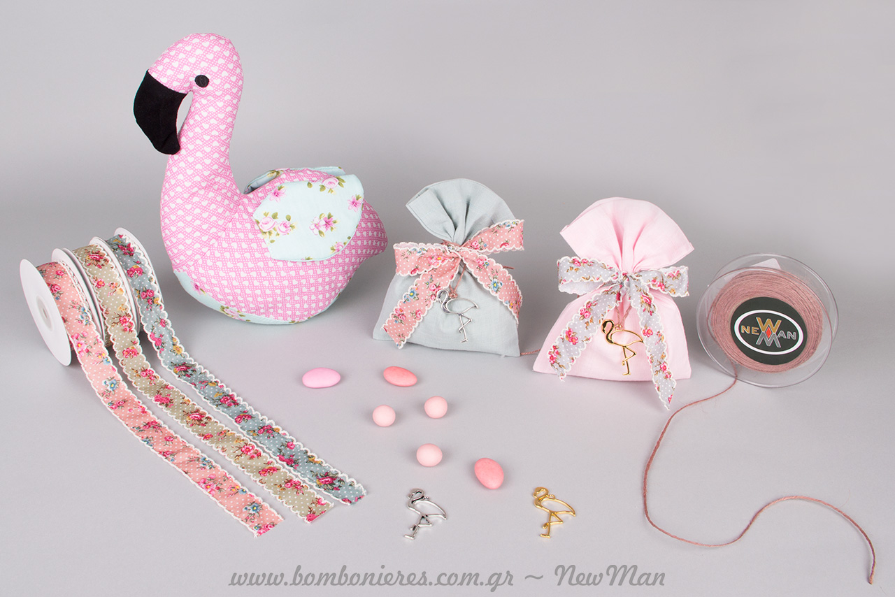 Τα μεταλλικά διακοσμητικά φλαμίνγκο σε ασημένια ή χρυσή απόχρωση θα αποτελέσουν το ιδανικό στολίδι της κοριτσίστικης μπομπονιέρας σας, η οποία αποτελείται από λινά πουγκάκια σε ροζ ή πράσινο της ελιάς, συνδυασμένα με κορδέλα υφασμάτινη (φλοράλ μοτίβο).
