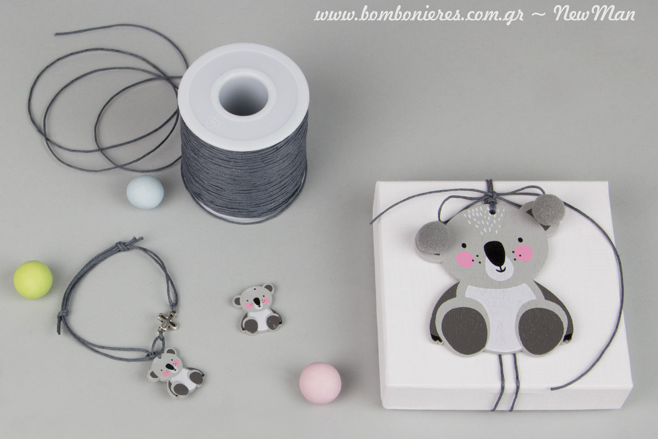 Για τα μαρτυρικά της βάπτισης προτείνουμε να δημιουργήσετε DIY βραχιολάκια, χρησιμοποιώντας το ίδιο κερωμένο κορδόνι ως βάση, στο οποίο θα προσαρμόσετε τόσο τα διακοσμητικά κοάλα που έχουν ακριβώς το ίδιο σχέδιο με αυτό των μπομπονιέρων – μόνο που είναι σε μικρότερο μέγεθος (20 x 25mm) όσο και τα επάργυρα σταυρουδάκια.
