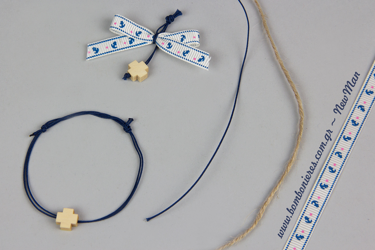 • Μαρτυρικά blue navy βραχιολάκια: για τη δημιουργία τους θα χρειαστείτε κορδόνι λεπτό χρωματιστό σε ναυτική μπλε απόχρωση (0.5mm x 100m) και ξύλινα σταυρουδάκια.