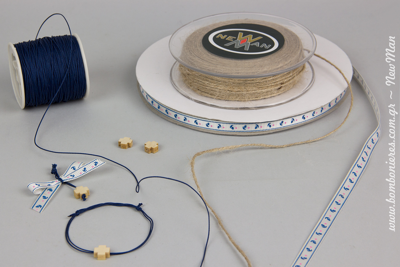 • Μαρτυρικό πέτου-φιογκάκι: για τη δημιουργία του θα χρειαστείτε: κορδέλα γκρο εκρού με άγκυρες (10mm x 91m), κορδόνι λεπτό χρωματιστό σε ναυτική μπλε απόχρωση (0.5mm x 100m) και ξύλινα σταυρουδάκια (10mm).