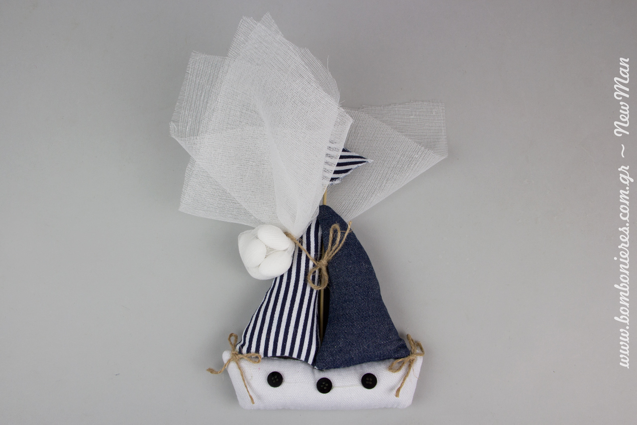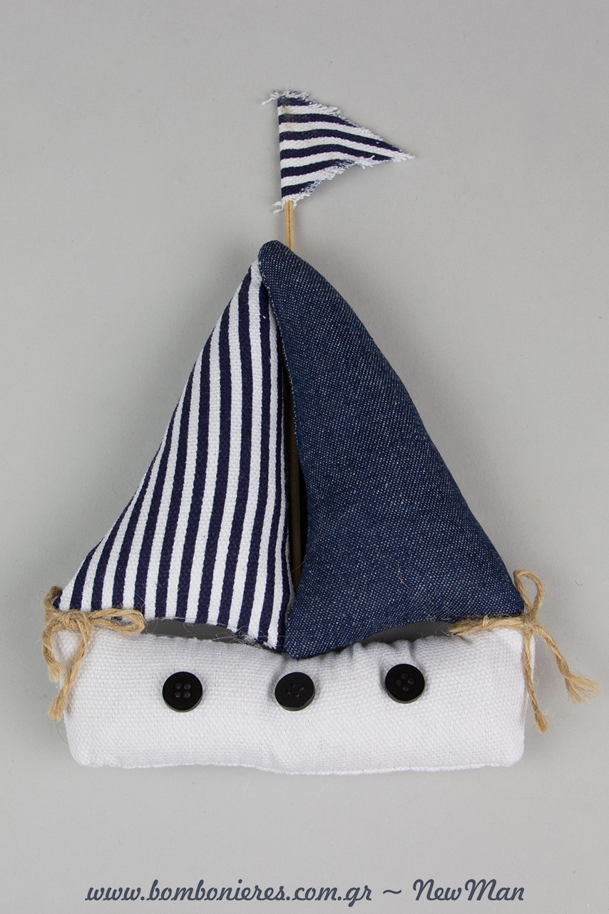 Μοντέρνο υφασμάτινο μαξιλαράκι καράβι που συνδυάζει το ριγέ σχέδιο με το τζιν ύφασμα για την αγορίστικη μπομπονιέρα βάπτισης.