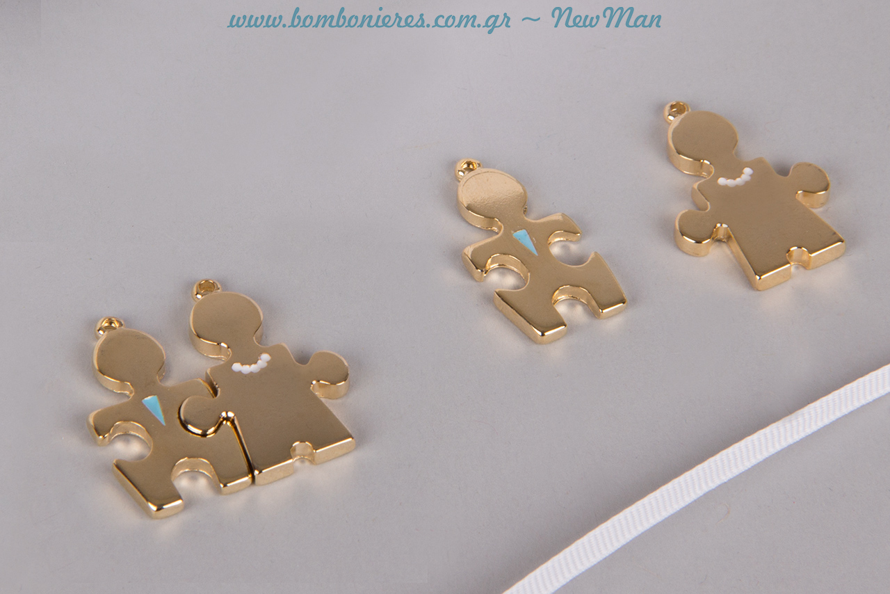 Μια DIY μπομπονιέρα που θα εντυπωσιάσει με την πρωτότυπη σύλληψή και τα χαριτωμένα χρυσαφένια διακοσμητικά της (κομμάτια παζλ γαμπρός & νύφη), τα οποία άνετα μπορούν να χρησιμοποιηθούν από τους καλεσμένους σας και μετά το πέρας του μυστηρίου (βραχιολάκι, κολιέ, μπρελόκ κα.).
