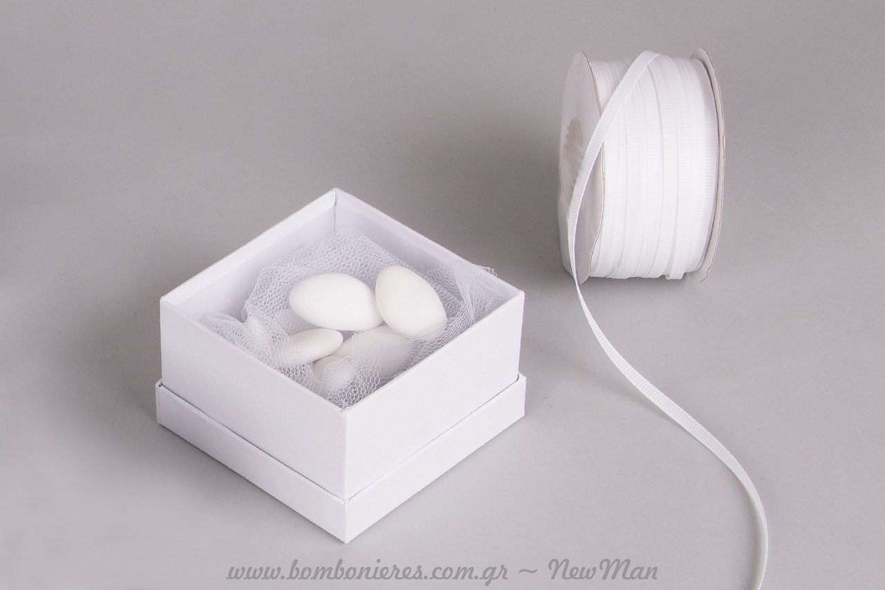 Βήμα 2ο : Τυλίγετε τα κουφέτα Χατζηγιαννάκης σε τούλι ελληνικό και τα τοποθετείτε μέσα στο κουτί. Βήμα 3ο : Κλείνετε το κουτί «δένοντας» το με κορδέλα γκρο λευκή την οποία θα περάσετε διπλή.