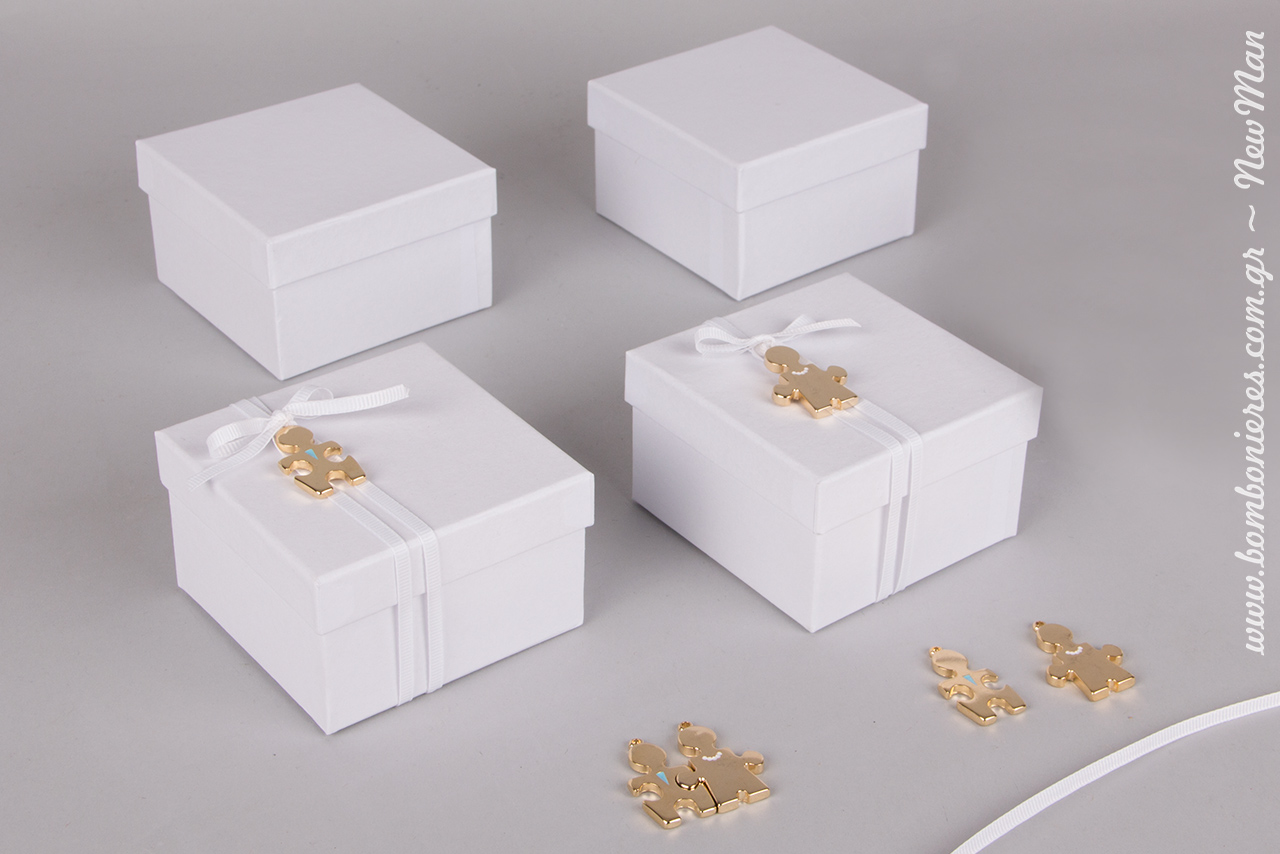DIY μπομπονιέρα γάμου «Το άλλο μου μισό» σε λευκό χάρτινο κουτί, διακοσμημένο με κορδέλα γκρο και κομμάτια παζλ Γαμπρός & Νύφη σε χρυσαφένια απόχρωση.