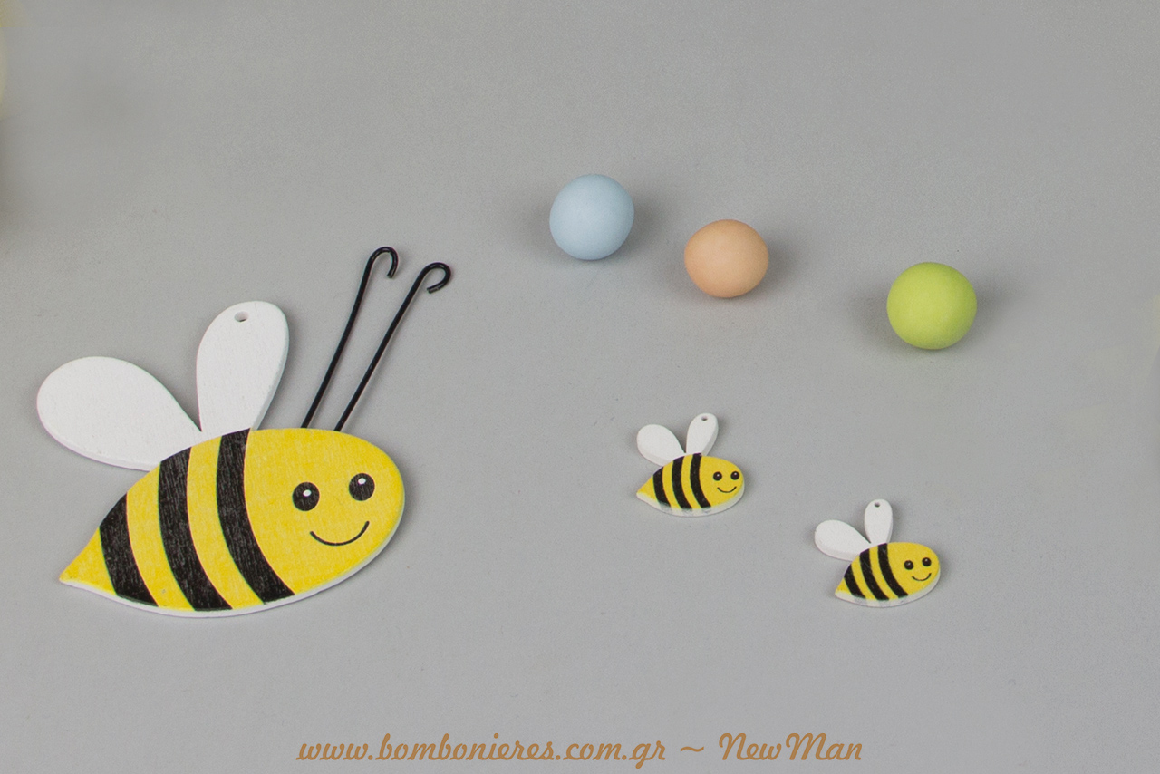 Θα σας προτείναμε επίσης να προμηθευτείτε και τις μικρές ξύλινες μελισσούλες (21 x 25mm) για να στολίσετε βαζάκια, μπολάκια ή ακόμη και τα γλυκίσματα που θα πρωταγωνιστήσουν στο candy bar, μένοντας έτσι συνεπείς στο παιχνιδιάρικο ύφος.