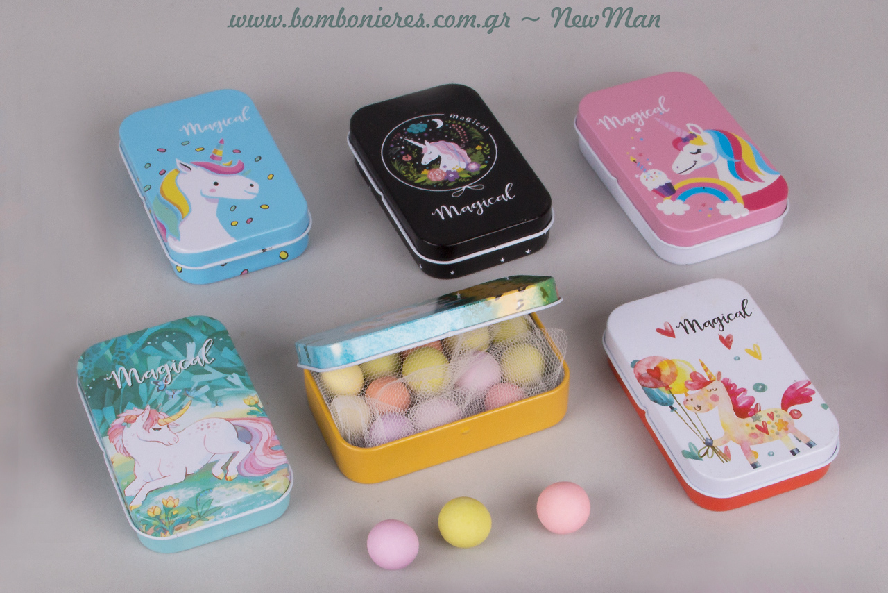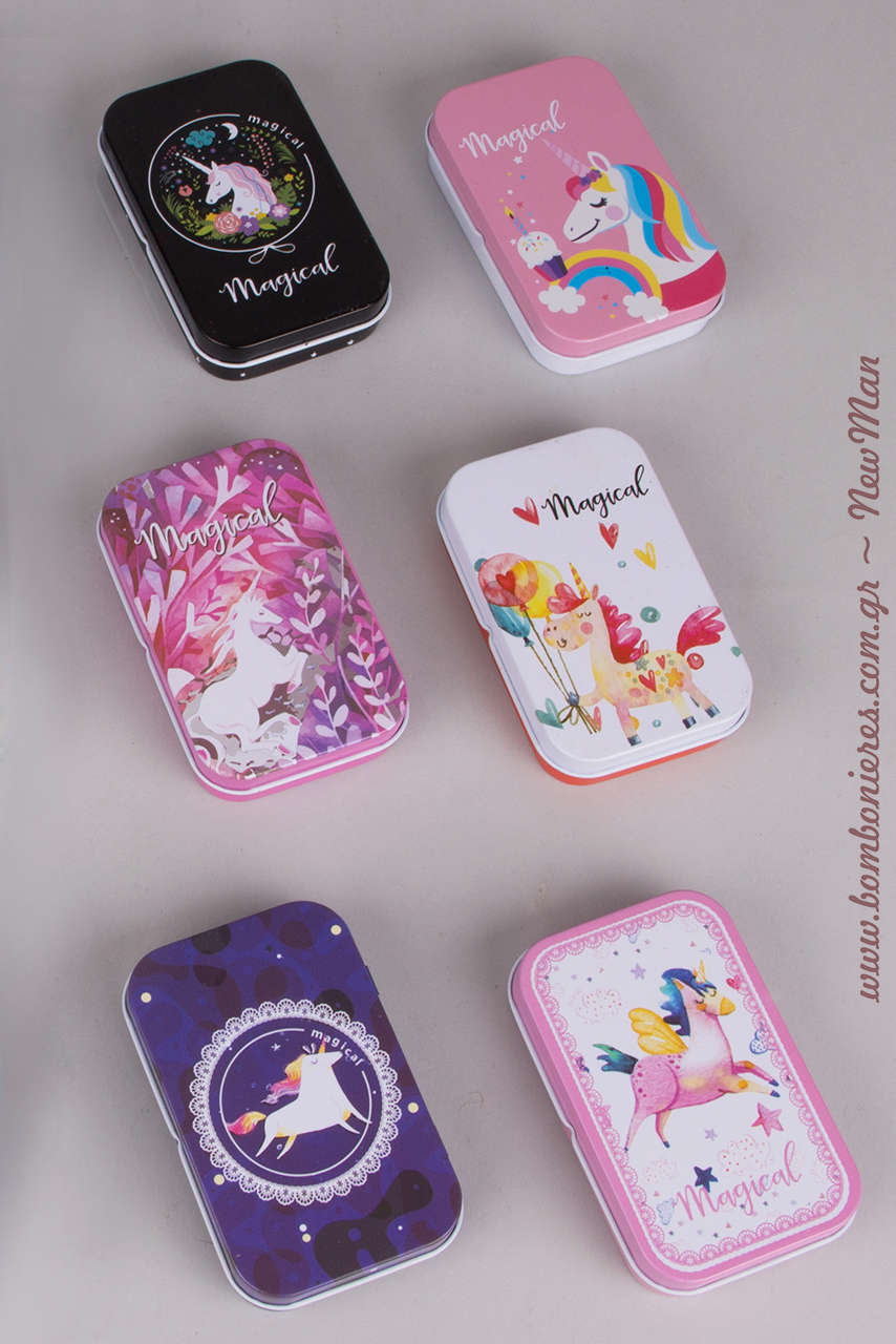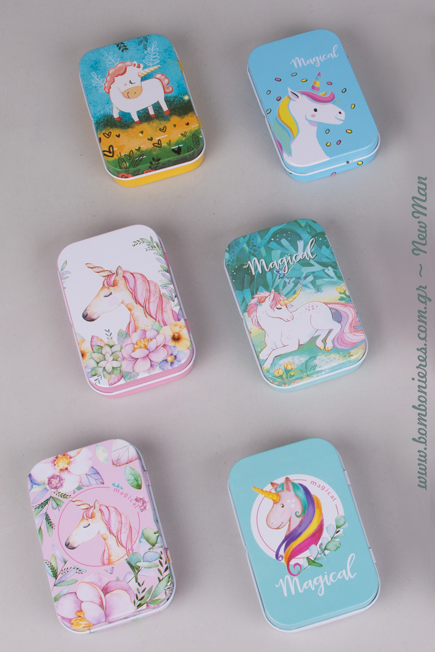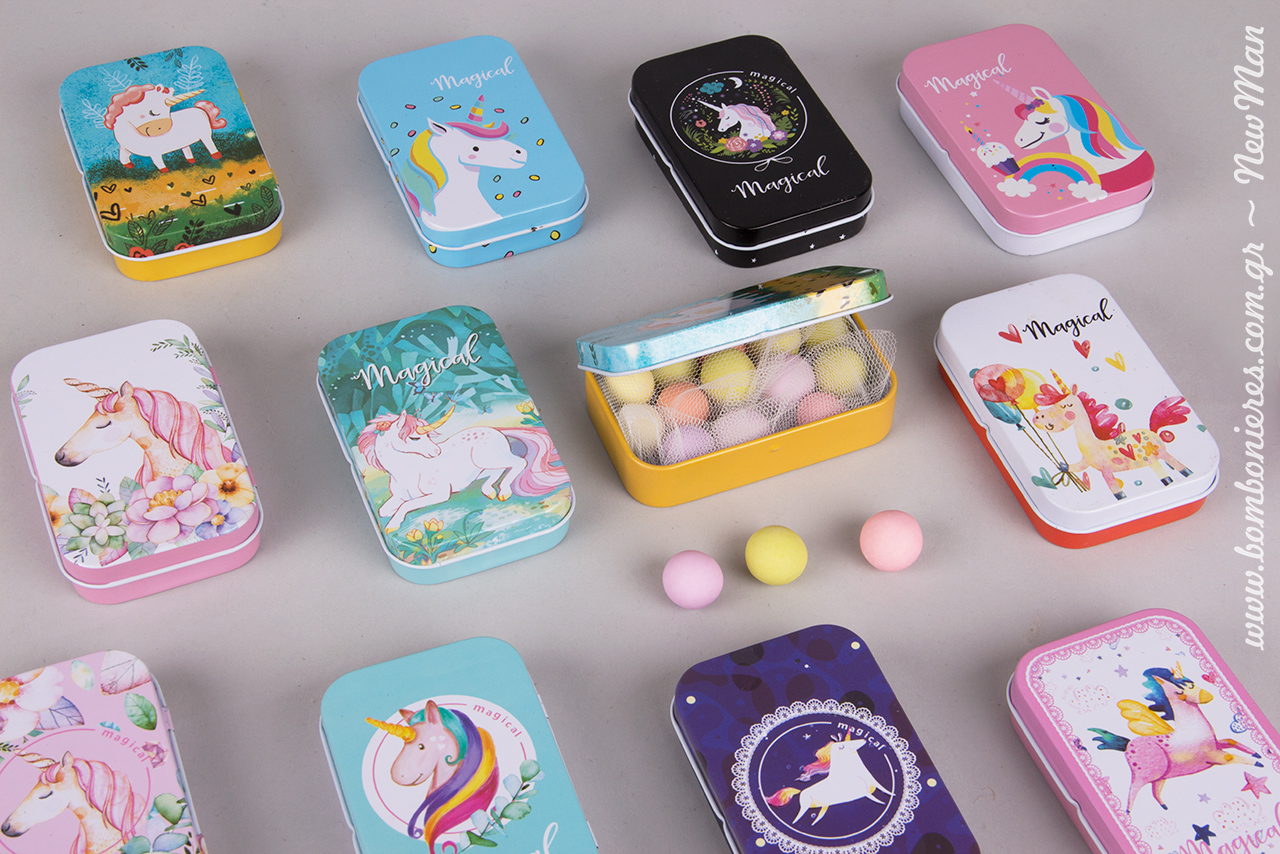 Τα μεταλλικά κουτιά με Μονόκερω (60x90x30mm) σε 12 διαφορετικά σχέδια και χρώματα που σας παρουσιάζουμε σήμερα θα φέρουν κάτι από τον κόσμο της μαγείας στη βάφτιση του μικρού ή της μικρής σας, χαρίζοντας μεγάλα χαμόγελα και κλέβοντας τις εντυπώσεις.