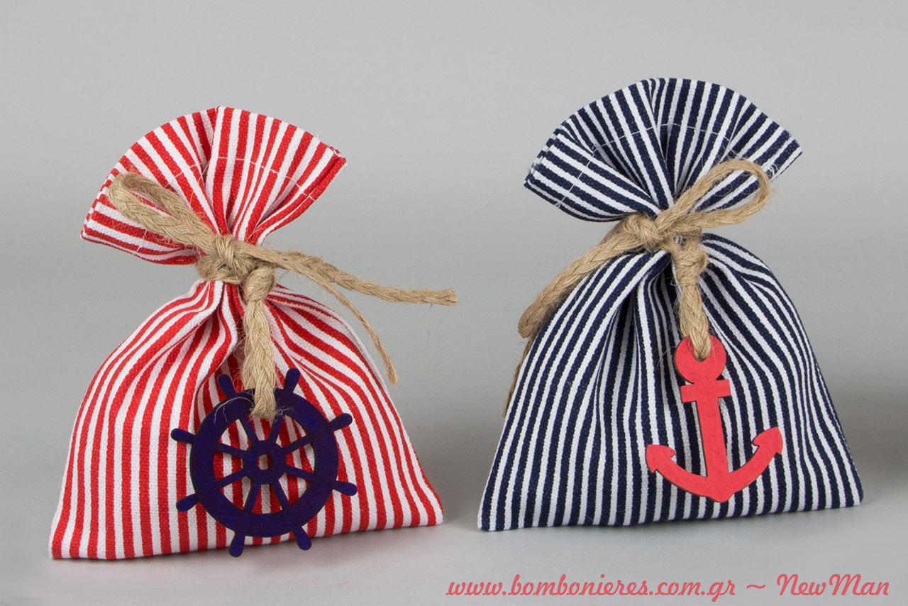 Μπομπονιέρα βάπτισης σε δίχρωμο ριγέ πουγκί καμβάς (κόκκινο- άσπρο, navy blue- άσπρο) διακοσμημένο με ξύλινη άγκυρα, ναυτικό τιμόνι και γιούτα πλεχτή.