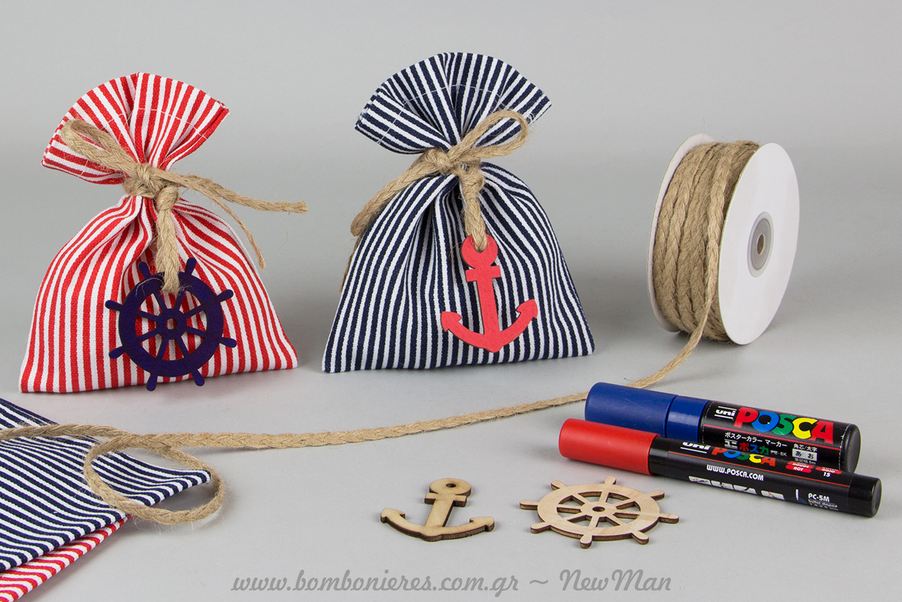 Για τη δημιουργία τους θα χρειαστείτε: ριγέ πουγκιά δίχρωμα (13 x 18cm), ξύλινα διακοσμητικά (άγκυρα-τιμόνι), γιούτα πλεχτή και μαρκαδόρους Uni-Posca.