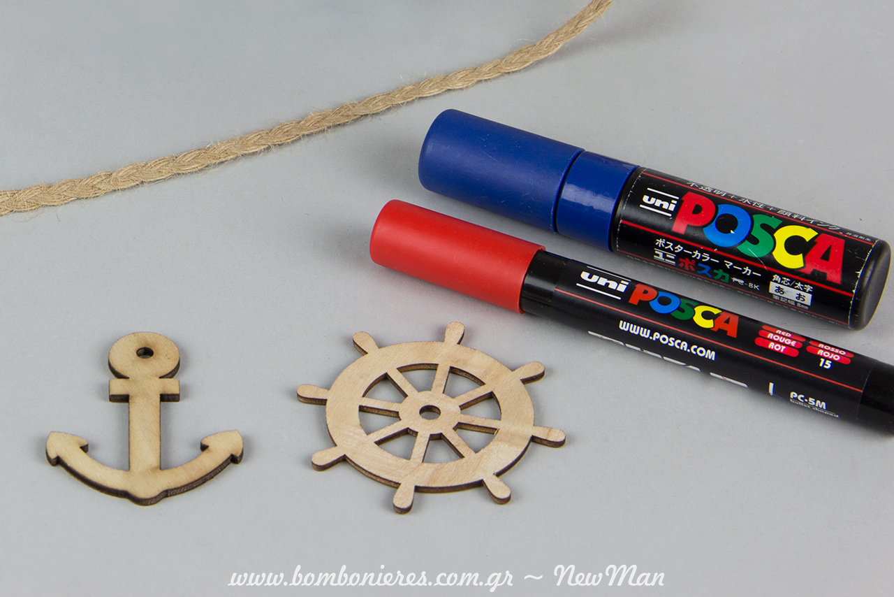 Τόσο οι διακοσμητικές άγκυρες όσο και τα τιμονάκια διατίθενται σε φυσική απόχρωση. Όπως θα δείτε και στις φωτογραφίες εμείς σας προτείνουμε να προμηθευτείτε μαρκαδόρους Uni Posca (PC 5M) σε μπλε και κόκκινο και να ζωγραφίσετε τα ναυτικά μας διακοσμητικά, χρησιμοποιώντας τα εναλλάξ και σε αντίθεση με το χρώμα του πουγκιού.