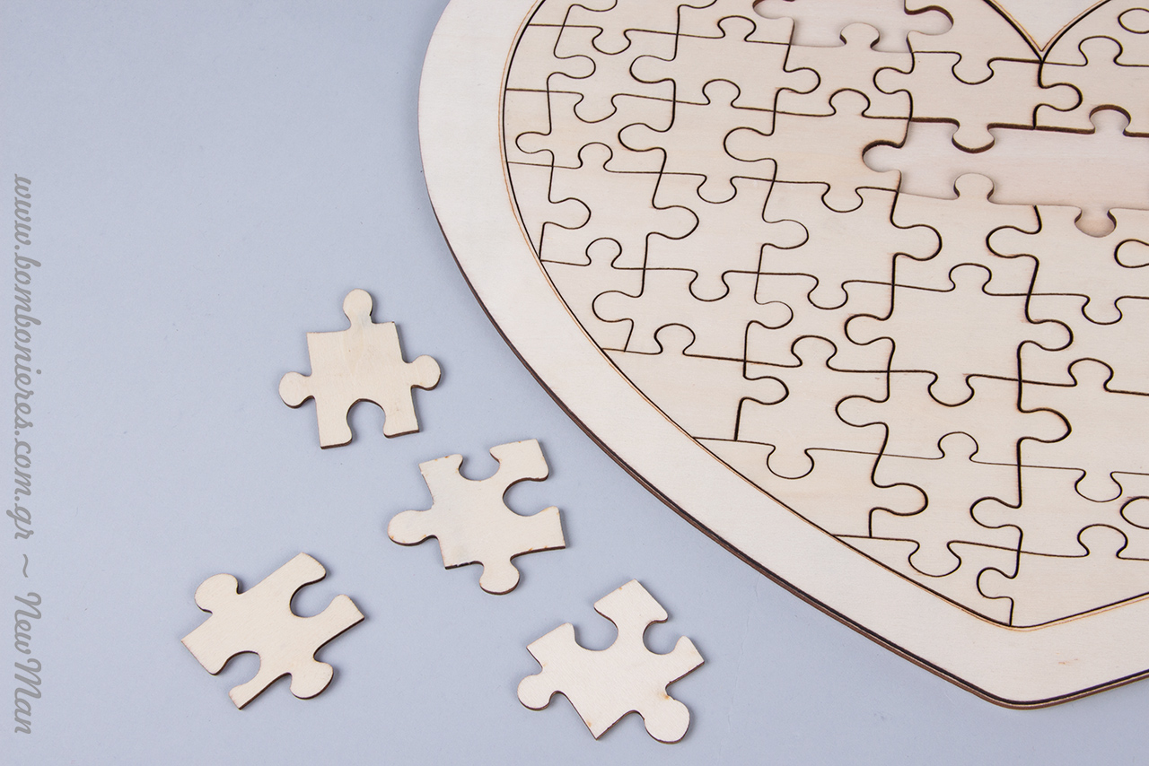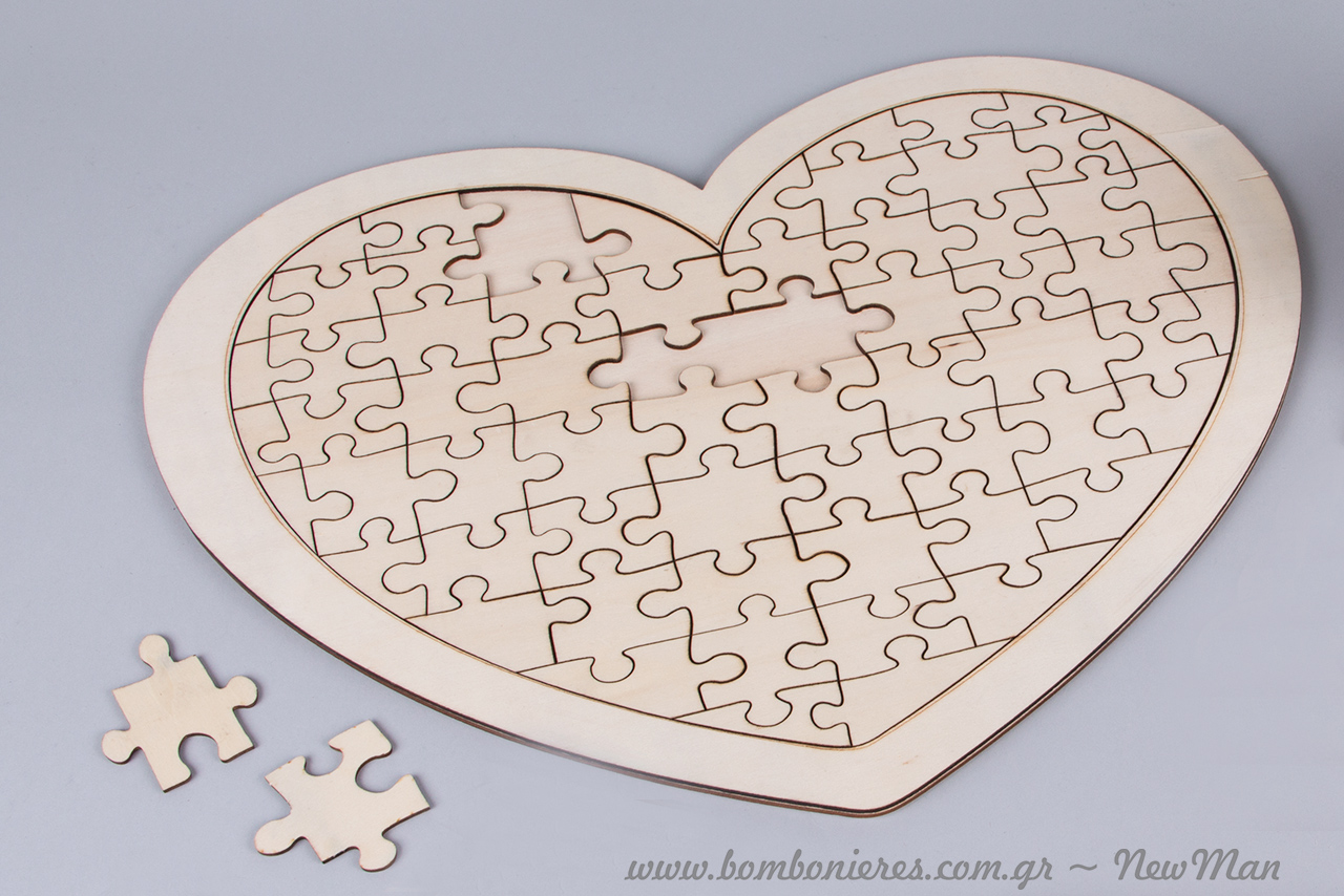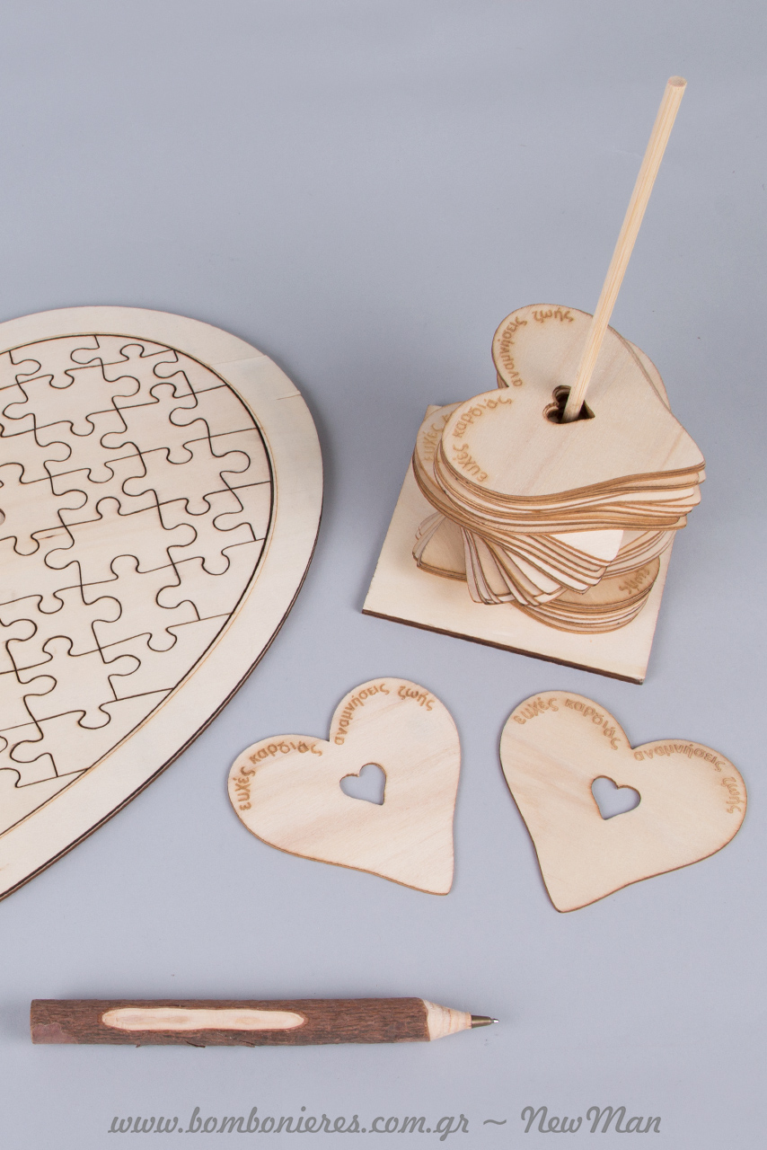Ξύλινο ευχολόγιο σε σχήμα καρδιάς με κομμάτια παζλ (222951) και ξύλινες καρδιές για ευχές από καρδιάς (074080) που θα αποτελέσουν αναμνήσεις ζωής για εσάς και τον/την καλό/η σας.