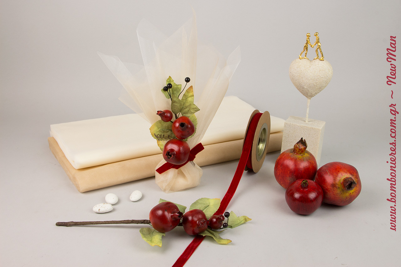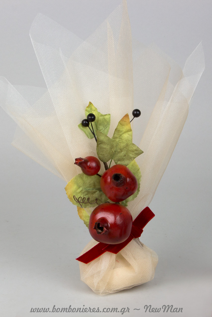 Μια καλότυχη μπομπονιέρα με θέμα ρόδι, που θα αποτελέσει ένα υπέροχο ενθύμιο της σημαντικής σας ημέρας.