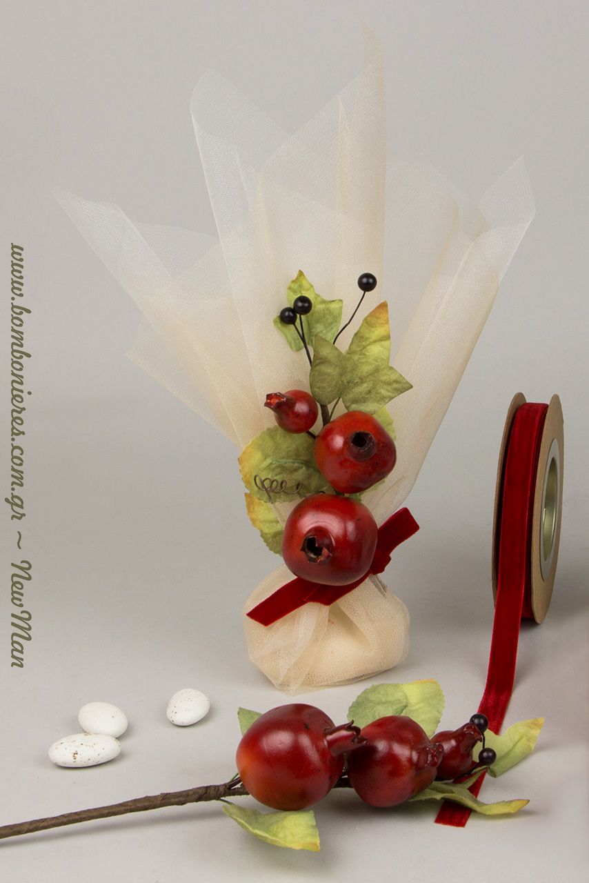 Τούλινη μπομπονιέρα με θέμα ρόδι, διακοσμημένη με κλαδί με ρόδια, φύλλα και μούρα και με βελούδινη κορδέλα Prague σε κόκκινο χρώμα.