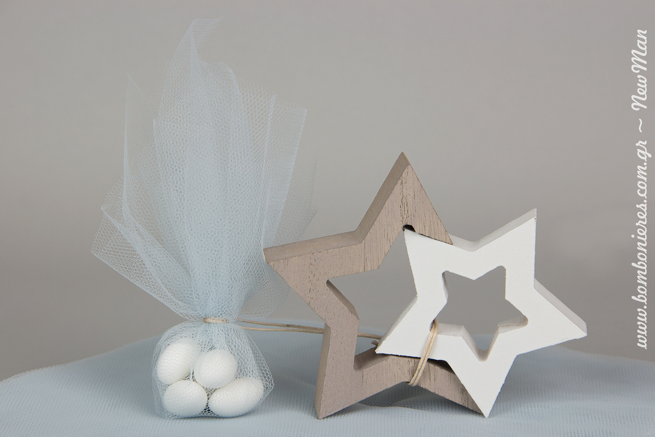 Η Λίλιαν Νιούμαν δημιούργησε τη ξεχωριστή αυτή μπομπονιέρα βάπτισης έχοντας ως βασικό διακοσμητικό στοιχείο τα ξύλινα αστέρια σε ουδέτερες αποχρώσεις (γκρι-λευκό). Εύκολη στην κατασκευή της, η μπομπονιέρα «Το τυχερό μου αστέρι» θα αποτελέσει ένα υπέροχο ενθύμιο της ημέρας που το δικό σας μικρό, φωτεινό και σούπερ τυχερό αστεράκι θα πάρει το όνομά του.