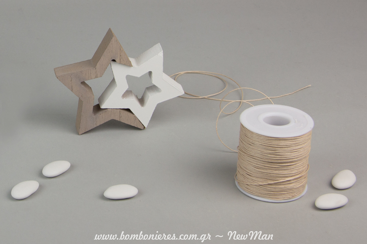 Για τη δημιουργία της, εκτός από τα ξύλινα διπλά αστεράκια (12,5 x 10 x 2cm) θα χρειαστείτε: τούλι ελληνικό (25 x 25cm) κορδόνι κερωμένο (1mm x 100m) και κουφέτα σοκολάτας Χατζηγιαννάκη σε λευκή ματ απόχρωση (Bijoux Supreme).