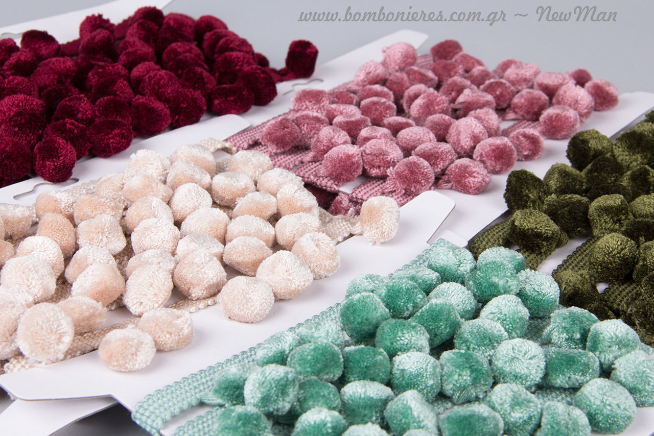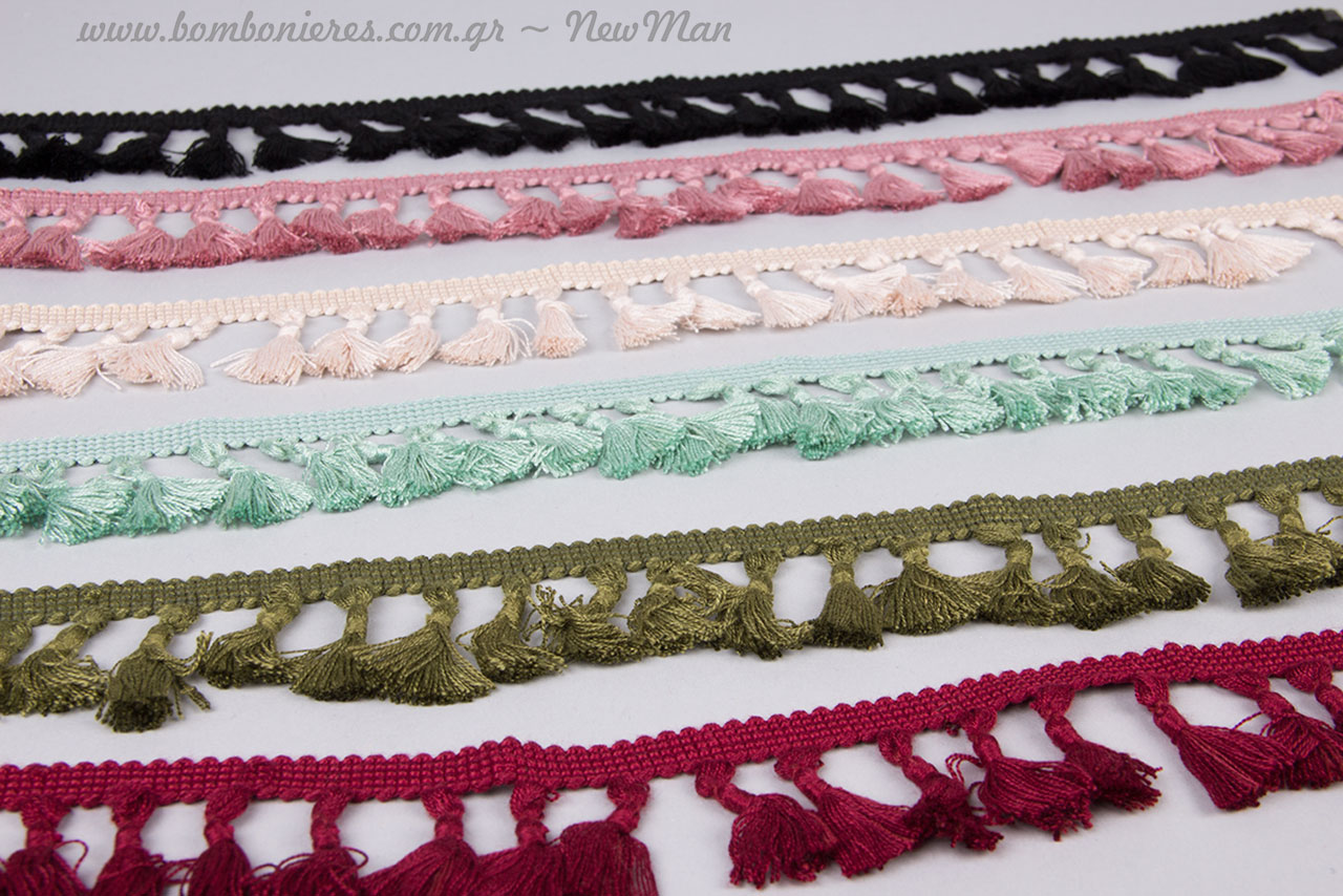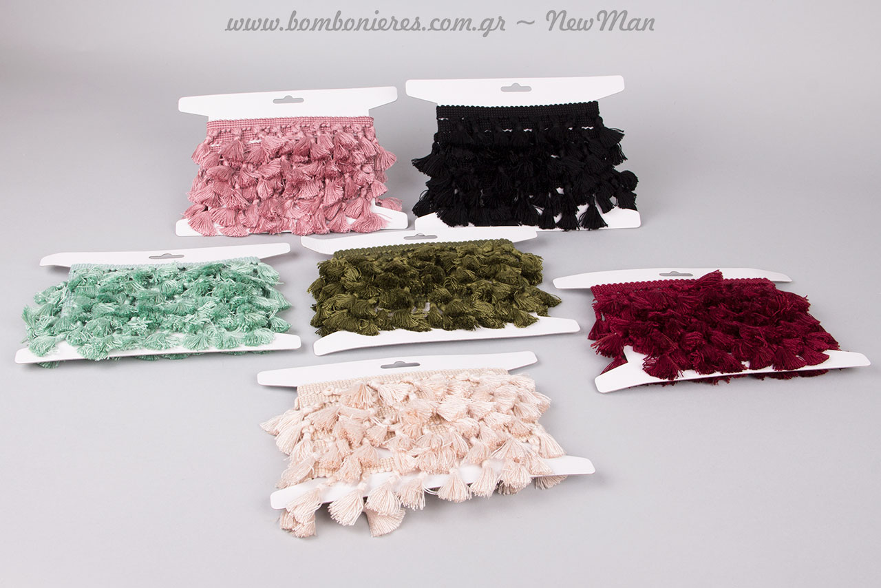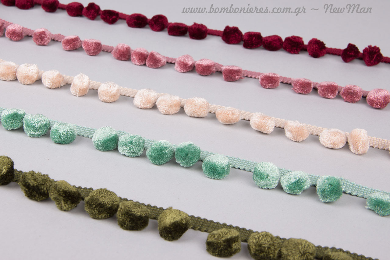 Παρουσιάζοντας διαρκώς νέα υλικά για χειροτεχνίες, μπομπονιέρες και DIY projects, θέλουμε να σας συστήσουμε τις βαμβακερές τρέσες με φούντες ή πομ πον που διαθέτουμε σε μια ποικιλία υπέροχων χρωματικών αποχρώσεων με φάρδος 5cm (τρέσα με φούντες) και 3cm (τρέσα με πομ πον) και μήκος δυο μέτρα.