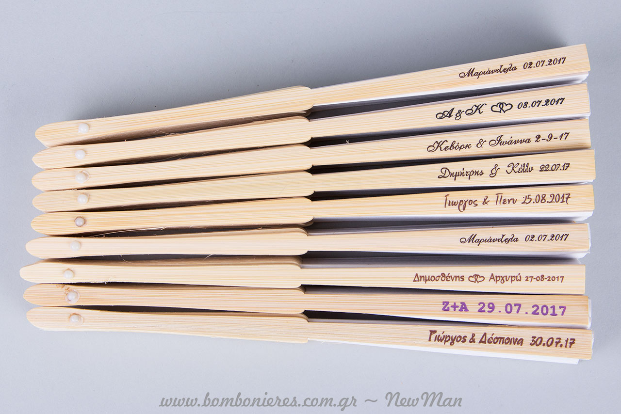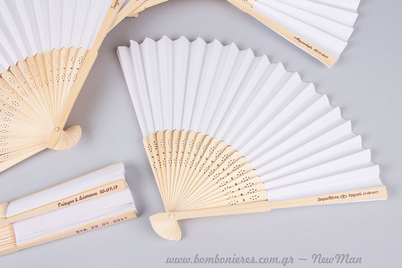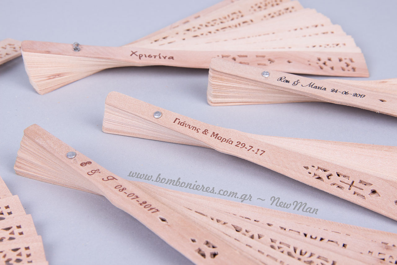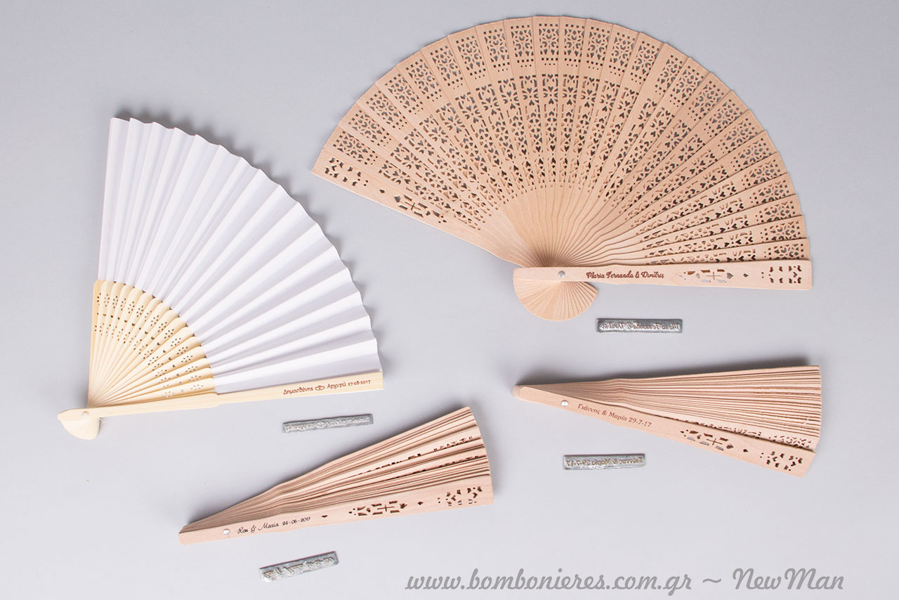 Προσωποποιήστε τις βεντάλιες, τυπώνοντας πάνω τους, τα αρχικά σας, την ημερομηνία του γάμου ή της βάπτισης κι όποια άλλη πληροφορία επιθυμείτε. Τώρα μπορούμε να τυπώσουμε πάνω στις βεντάλιες τις πληροφορίες που επιθυμείτε (αρχικά ονομάτων, ημερομηνία κλπ.) Ξύλινες βεντάλιες με σκαλιστά σχέδια που τις κάνουν να μοιάζουν με λουλούδια όταν είναι ανοιχτές.