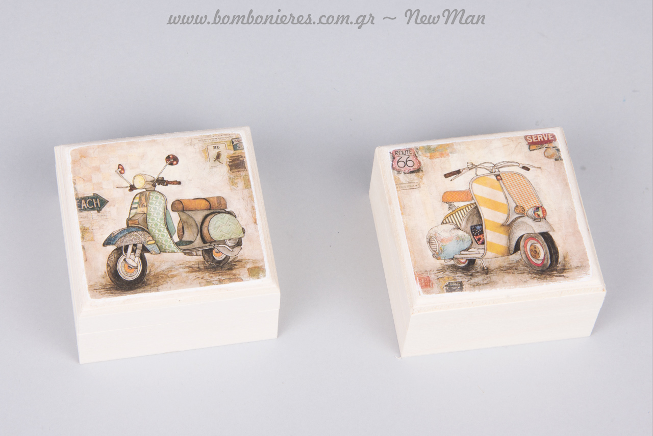 Vintage κουτί-μπιζουτιέρα με σχέδιο βέσπα σε δυο παραλλαγές (ριγέ ή πράσινη) για αγορίστικη μπομπονιέρα.