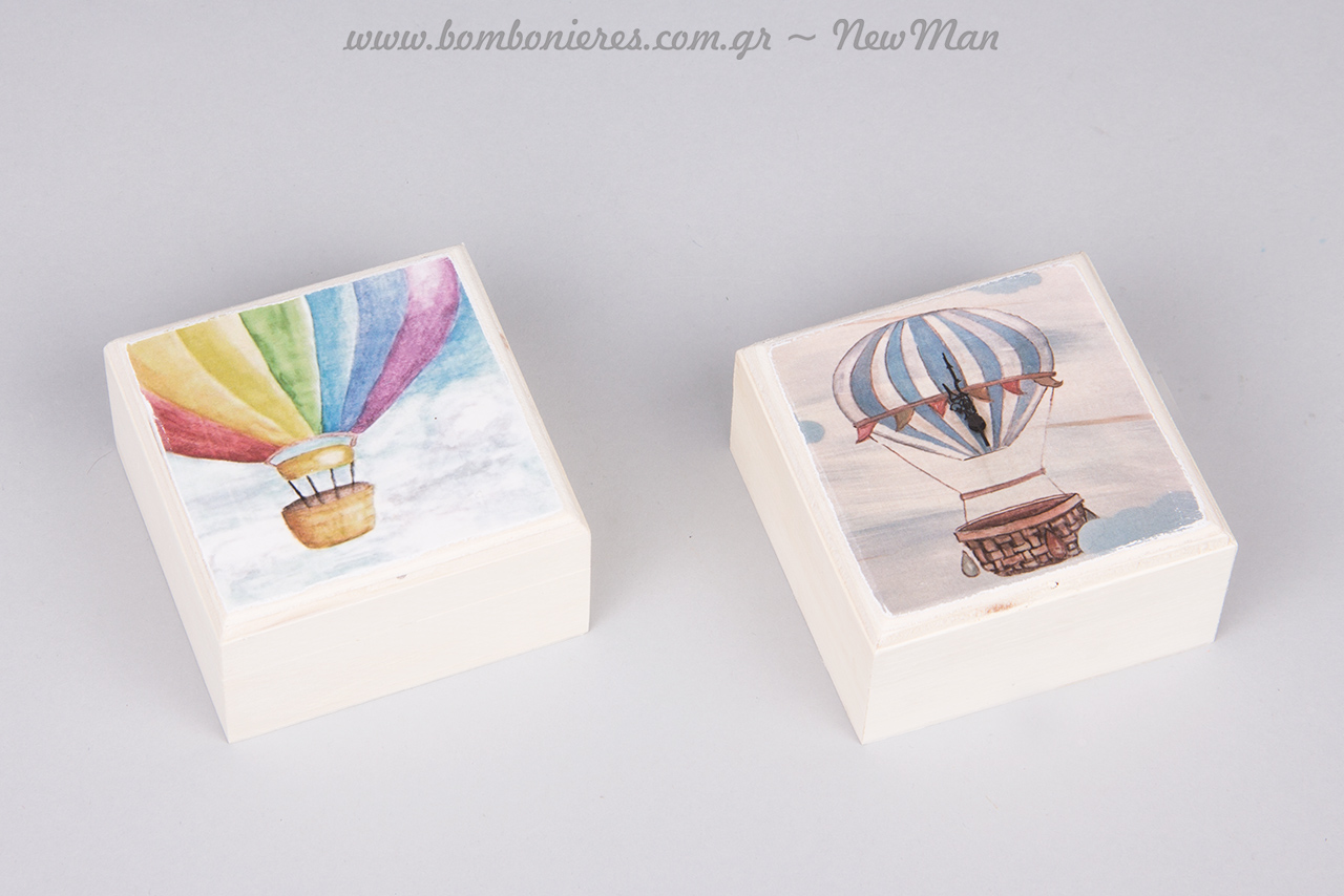 Ξύλινο κουτί-μπιζουτιέρα με σχέδιο αερόστατο σε δυο παραλλαγές (σιέλ αερόστατο & πολύχρωμο).