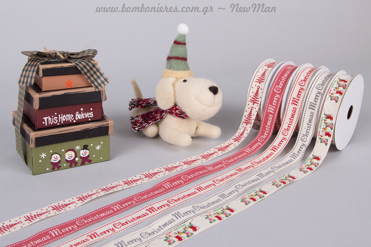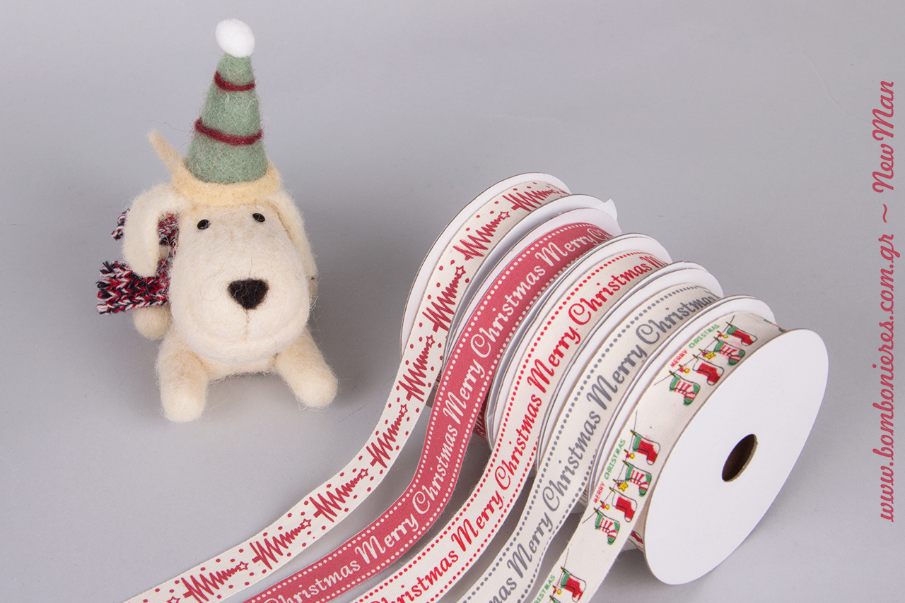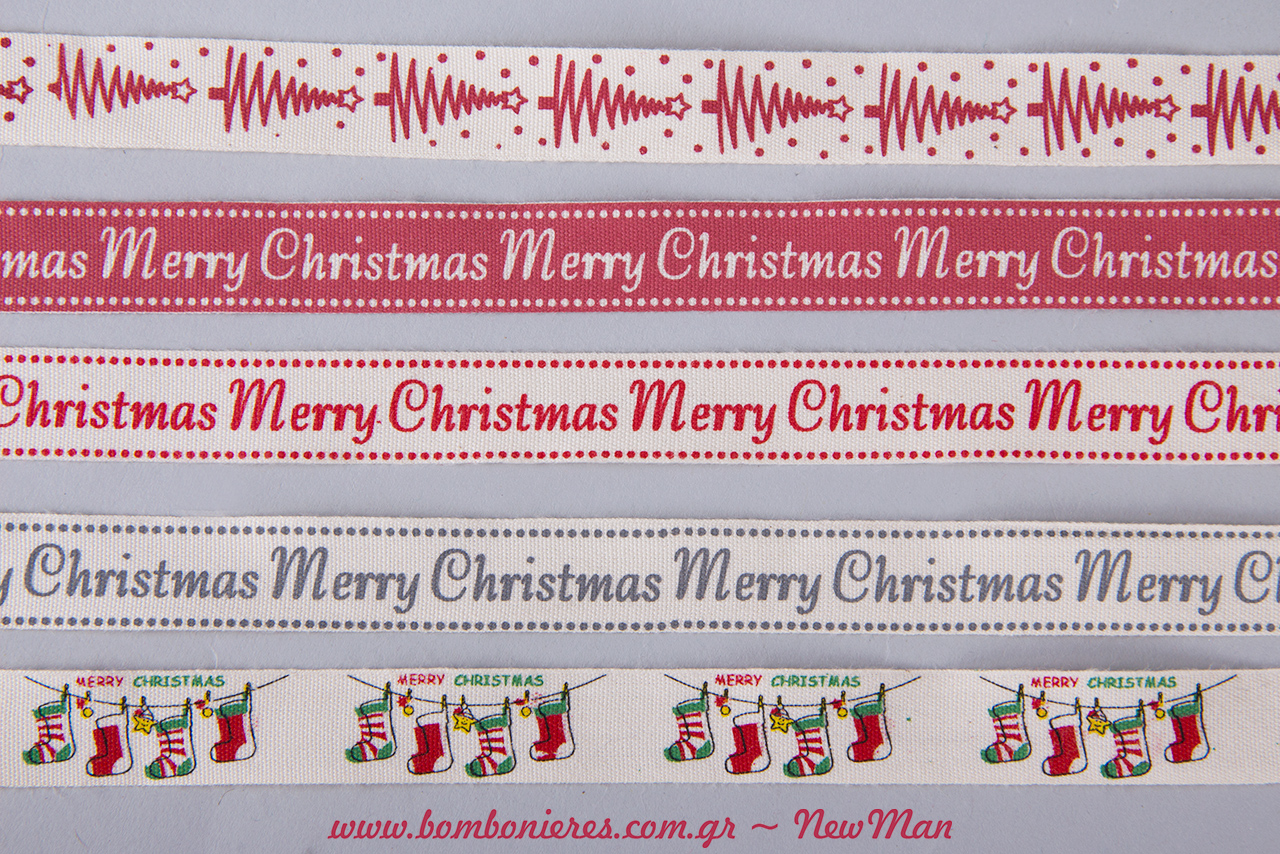 Υφασμάτινες κορδέλες Merry Christmas (δίχρωμες: κόκκινη με λευκό τύπωμα, λευκή με κόκκινο και λευκή με γκρι τύπωμα), κορδέλα με τύπωμα Δέντρο και κορδέλα με τύπωμα κάλτσες Χριστουγέννων, είναι στη διάθεσή σας προκειμένου να μεταμορφώσετε τις κάθε είδους δημιουργίες σας.