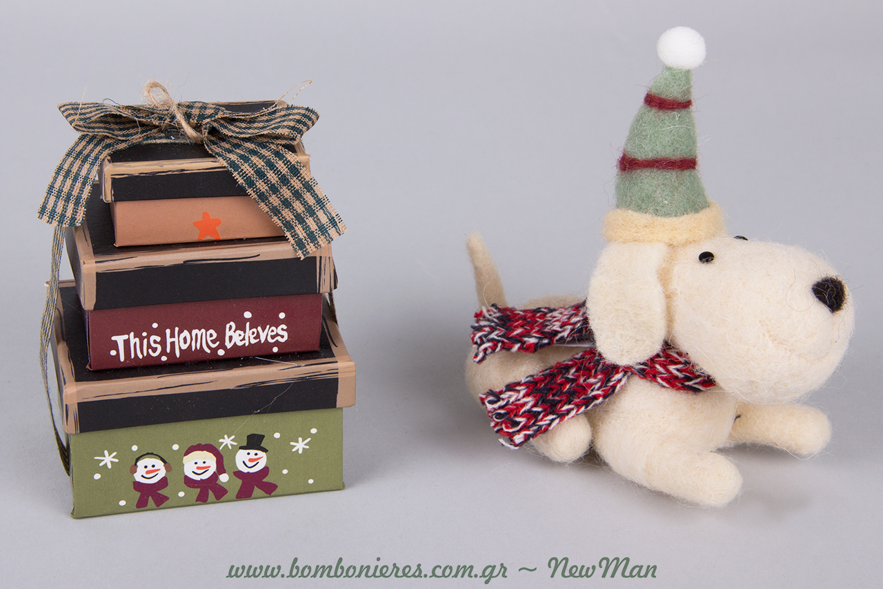 Όσο για τα παιχνιδοστολίδια μας: τα κρεμαστά κουτιά και τον γλυκούλη καθιστό σκύλο με κασκόλ, θα κλέψουν καρδιές όπως κι αν χρησιμοποιηθούν. Από το Χριστουγεννιάτικο Δέντρο και τις επιτραπέζιες συνθέσεις, μέχρι το παιδικό δωμάτιο και τα δωράκια σας. Μια ωραία ιδέα πχ. είναι να βάλετε κάποιο από αυτά ή και τα δυο στις σακούλες μαζί με τα δώρα σας σε βαφτιστήρια κι ανιψάκια, δίνοντας τους έτσι κι έναν επιπλέον λόγο να σας λατρεύουν.