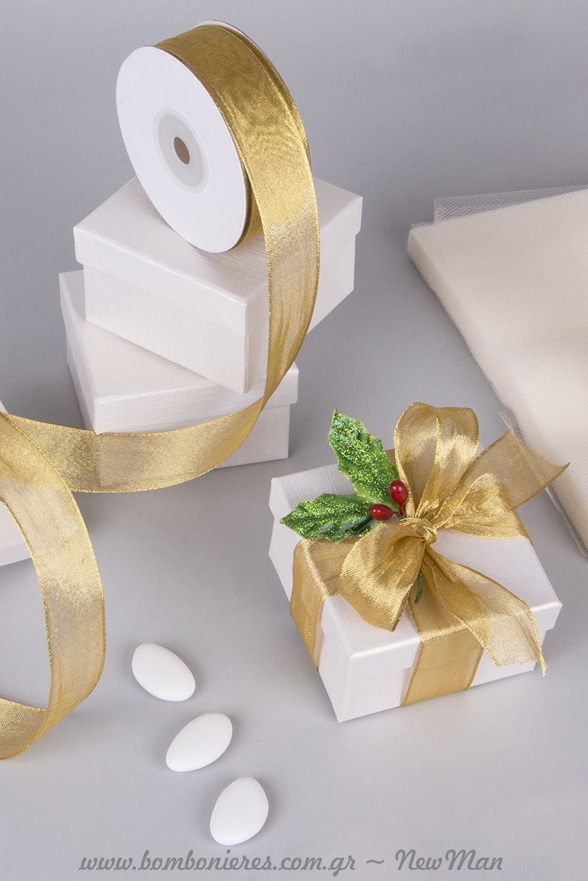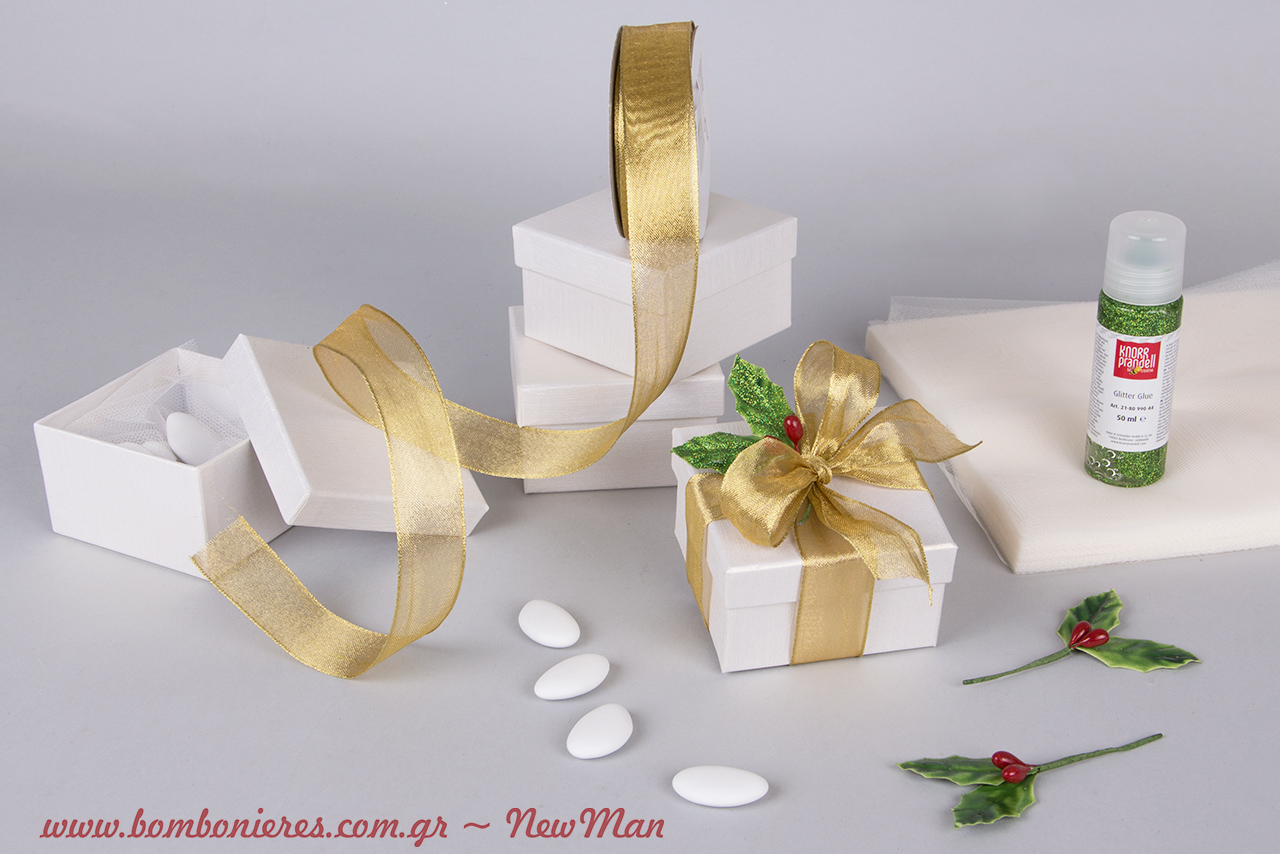 Χριστουγεννιάτικη μπομπονιέρα γάμου σε κουτί λευκό/εκρού (8 x 8 x 5cm), διακοσμημένο με διάφανη κορδέλα σε χρυσαφί απόχρωση (σύρμα) και μπουτονιέρα σε χριστουγεννιάτικο ύφος (γκι).
