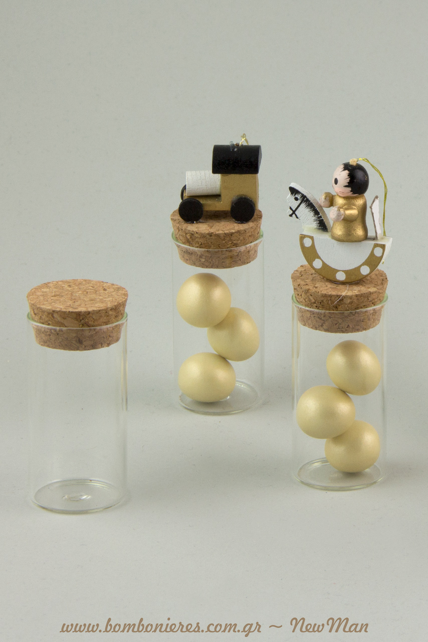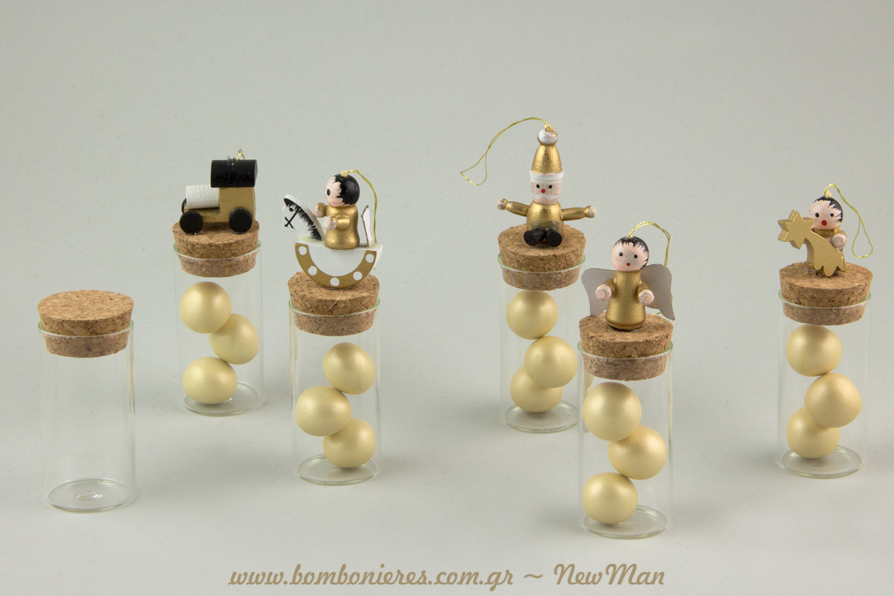 Για τη δημιουργία της μπομπονιέρας – χριστουγεννιάτικο στολίδι θα χρειαστείτε τα εξής υλικά: γυάλινο σωλήνα (30 x 60mm) – διατίθεται και σε συσκευασία των 12 τεμαχίων, ξύλινα χρυσά στολίδια (18 x 18 x 2cm) – διατίθενται σε συσκευασία των 20 τεμαχίων, καθώς επίσης και κουφέτα Χατζηγιαννάκης Crispy Περλέ σε σαμπανί απόχρωση.