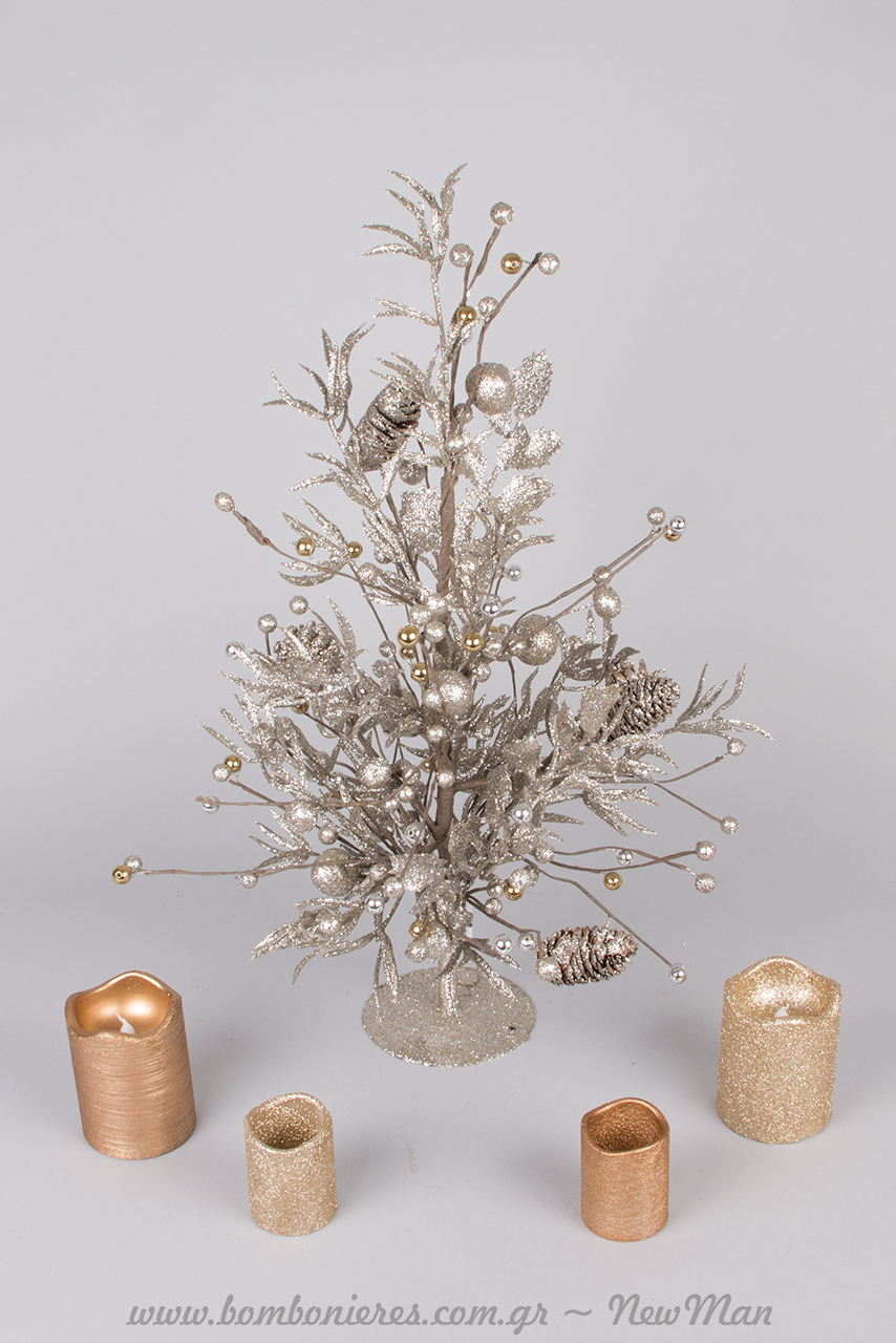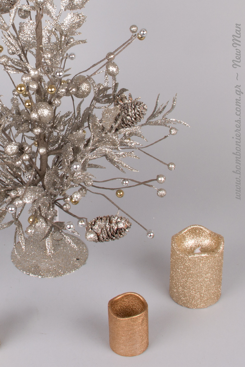 Mini Χριστουγεννιάτικο δέντρο σε ασημί απόχρωση. Χρυσαφένιο Κερί led σε δυο διαστάσεις (φ7 x 9cm, φ8 x 7cm) που λειτουργεί με χρονοδιακόπτη.