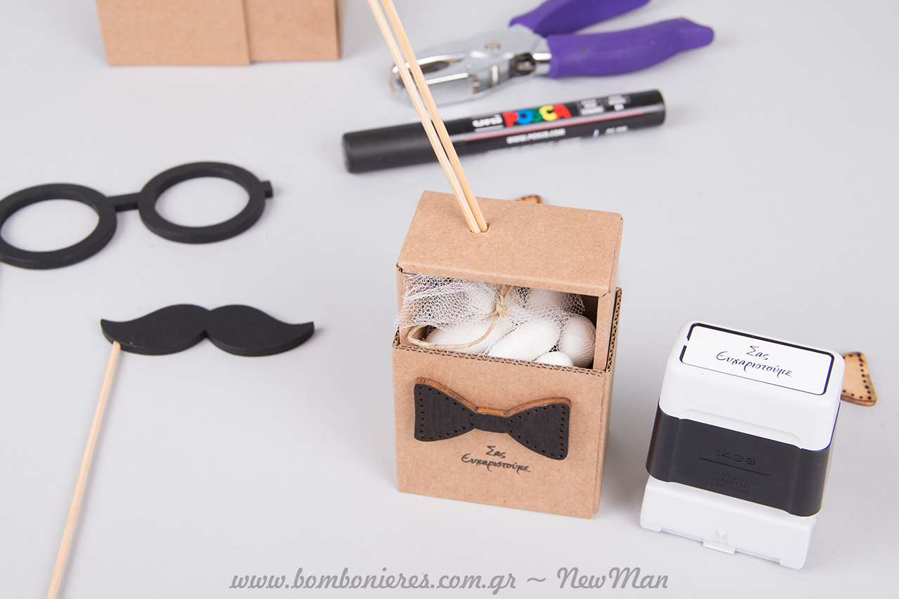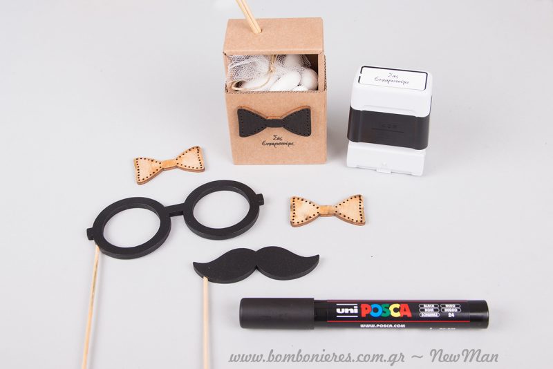 Τα ξύλινα γυαλιά και το ξύλινο μουστάκι, ολοκληρώνουν μοναδικά την ατμόσφαιρα και θα χαροποιήσουν ιδιαίτερα τους μικρούς σας καλεσμένους. Μια τέλεια αφορμή για παιχνίδι, η μπομπονιέρα του μικρού κυρίου σε κουτί, θα κλέψει σίγουρα τις εντυπώσεις.