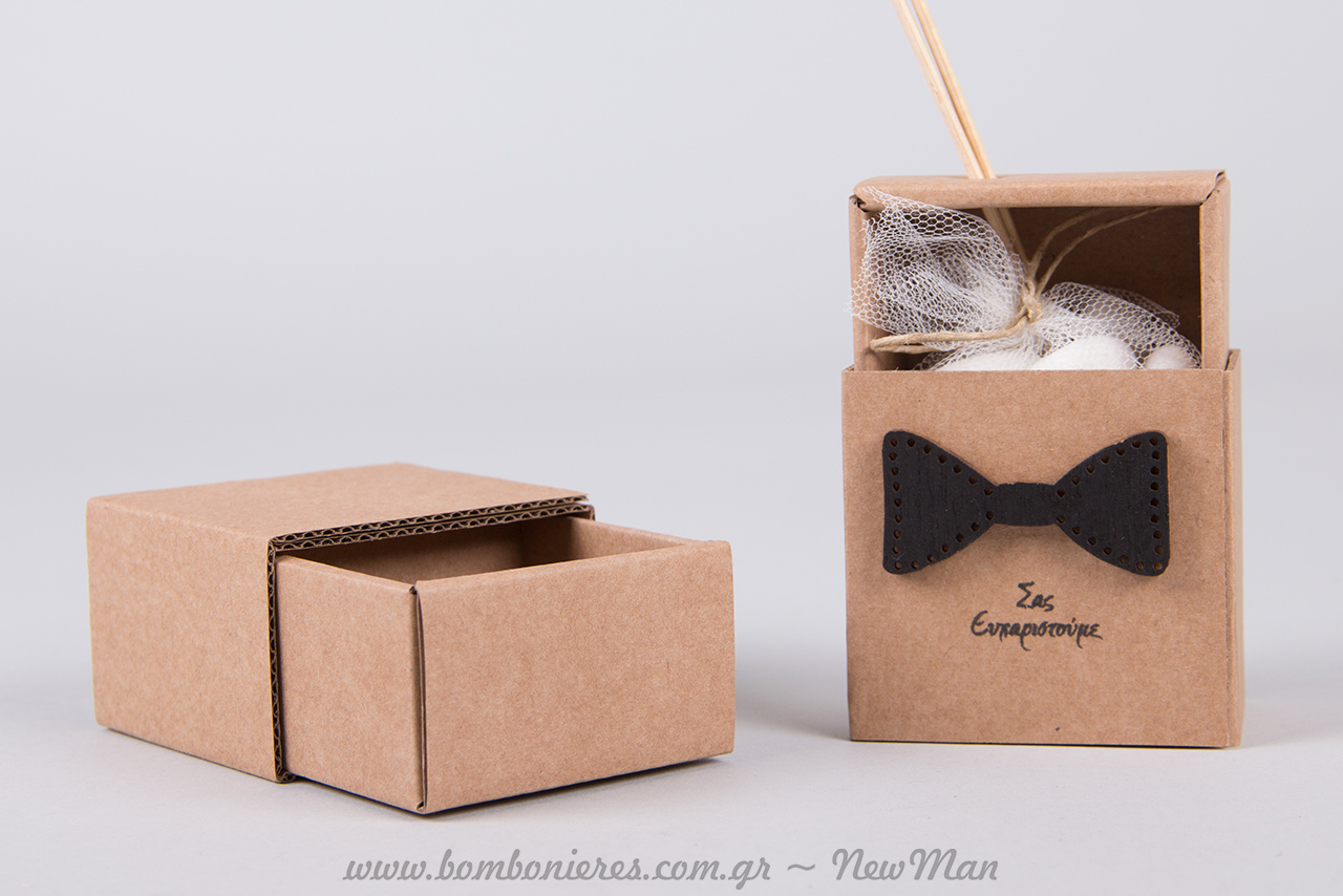 Εμπνευσμένη από την μόδα της εκείνη της εποχής, η Λίλιαν Νιούμαν δημιούργησε την μπομπονιέρα του μικρού κυρίου σε κουτί, χρησιμοποιώντας ως βάση, τα γνωστά οικολογικά Kraft κουτιά τύπου σπιρτόκουτο. Το ξύλινο παπιγιόν χρωματίστηκε με μαύρο μαρκαδόρο και κολλήθηκε προσεχτικά πάνω στο κουτάκι μας, το οποίο σφραγίσαμε κιόλας με σφραγίδα Brother (με επιγραφή “Σας ευχαριστούμε”).