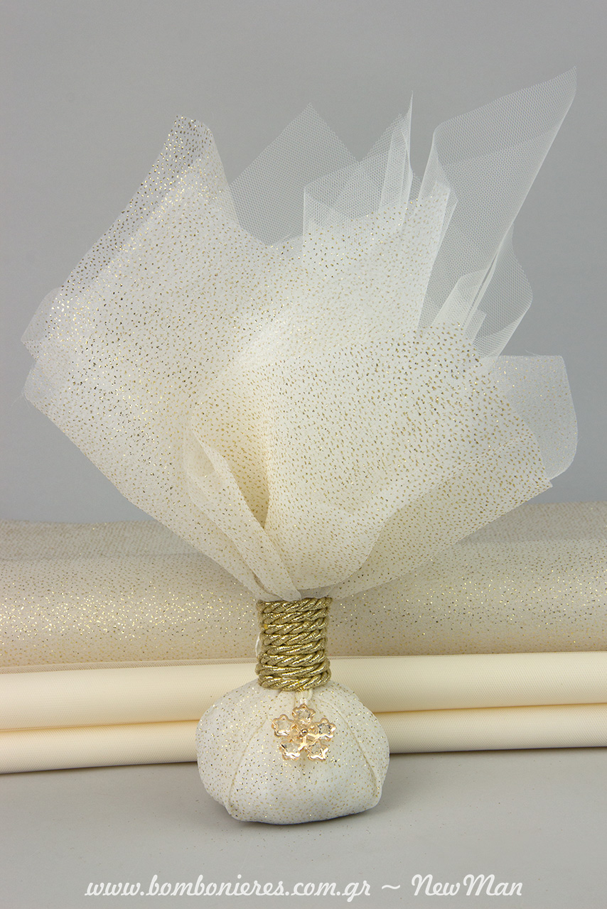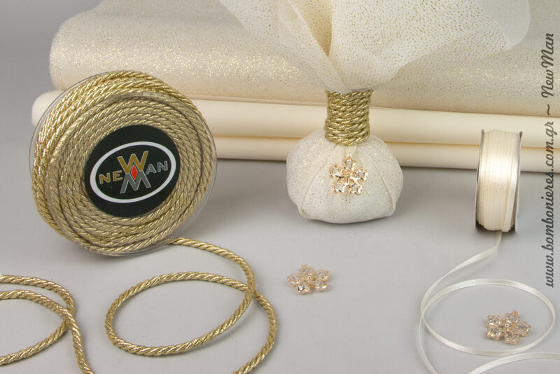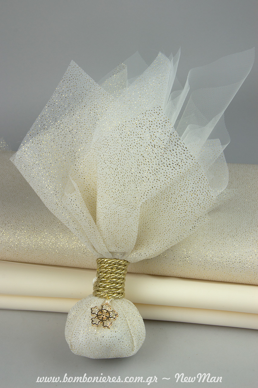 Για τη δημιουργία της θα χρειαστείτε τα εξής υλικά: διακοσμητικό μεταλλικό λουλούδι με γυαλάκια (25mm), μαντήλι γκλίτερ τετράγωνο (48 x 48cm), ελληνικό τούλι (39 x 39cm), γαλλικό τούλι (50 x 50cm) – και τα δυο σε ιβουάρ απόχρωση- κορδέλα Nylon Satin DF Μπομπ και κορδόνι τρίκλωνο σε μεταλλική χρυσή απόχρωση.