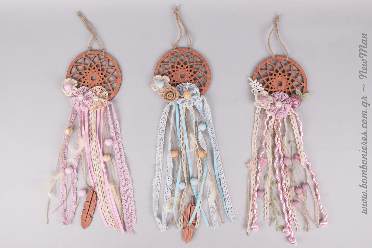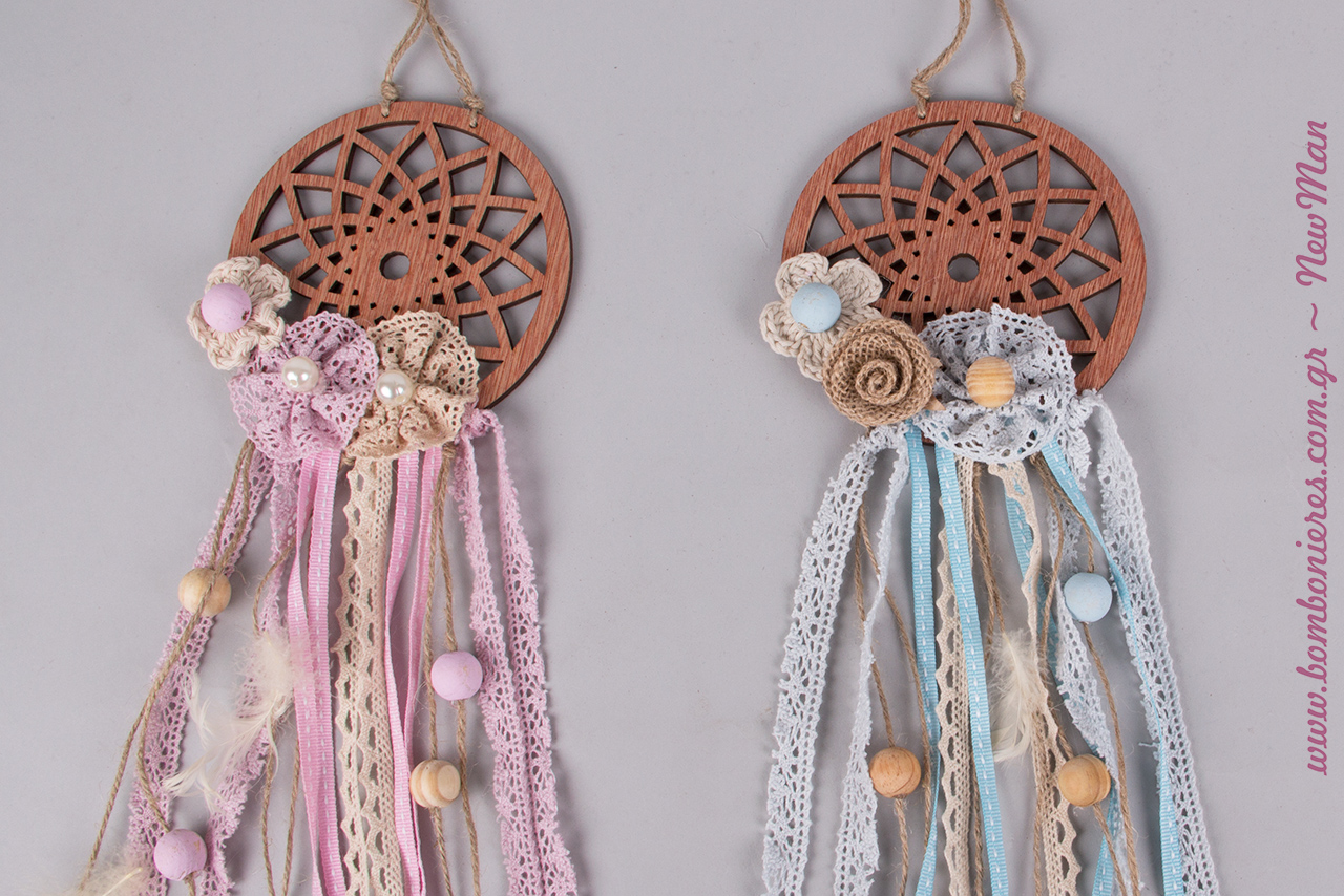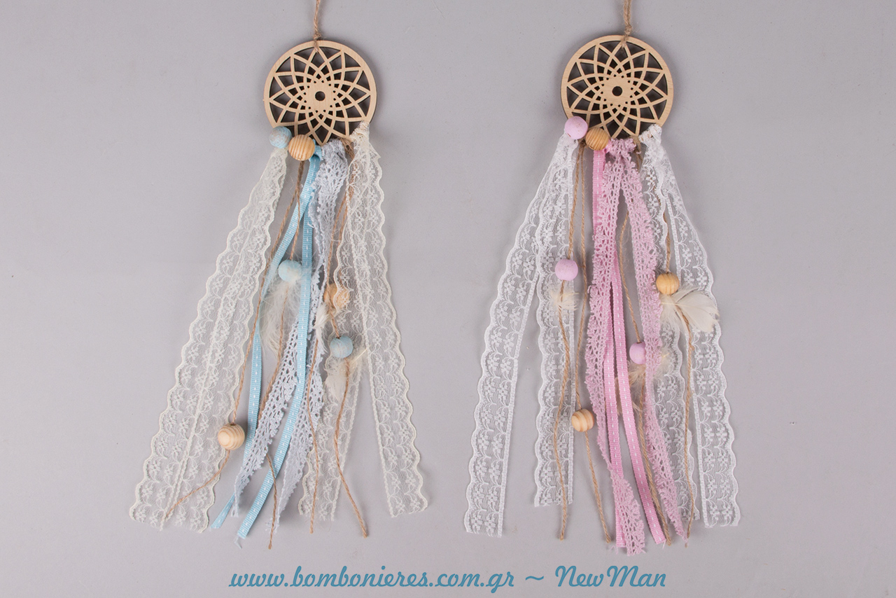 Οι μεγάλες ξύλινες διάτρητες Ονειροπαγίδες (12 x 40cm) σε ροζ και σιέλ απόχρωση είναι πανέμορφες και διαθέτουν υπέροχες δαντελένιες λεπτομέρειες, χάντρες, λουλουδάκια πέρλες και φτερά. Αρκετά χορταστικές σε μέγεθος θα αποτελέσουν το ιδανικό πρωταγωνιστικό στοιχείο τόσο στο στολισμό της εκκλησίας όσο και στη διακόσμηση της δεξίωσης ή του τραπεζιού των ευχών. Ιδανικές φυσικά και για το στολισμό της βαπτιστικής λαμπάδας.